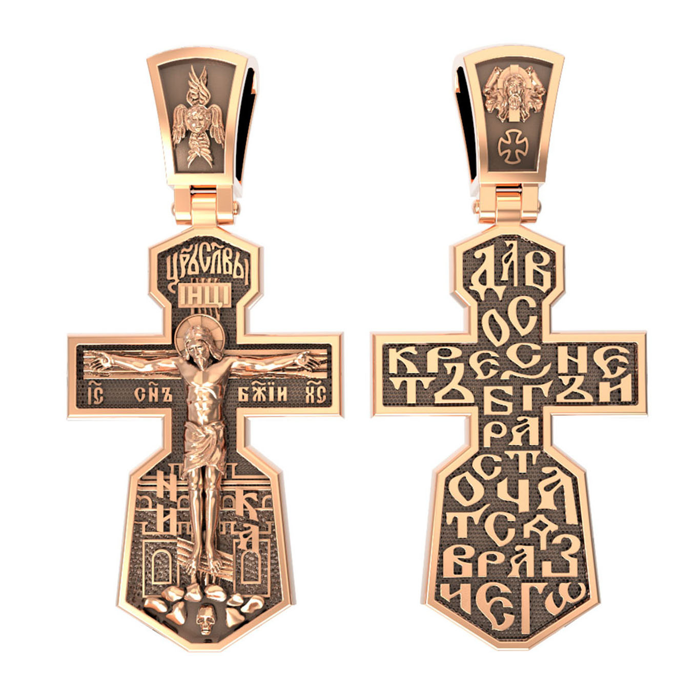 На лицевой стороне креста изображено Распятие Иисуса Христа. Господь представлен свободно покоящимся на кресте с простертыми руками и как бы обнимающим всю Вселенную. Он — Спаситель, искупивший грехи мира, «поправший смертию смерть» и призывающий к Себе «все концы земли». Поэтому рядом с Его образом помещены слова — «НИКА» и «Царь Славы». Эти слова характеризуют Господа как Великого Архиерея, победителя смерти. Верхняя перекладина символизирует титло — табличку, на которой, согласно Евангелию, было начертано: Иисус Назорей Царь Иудейский (IНЦI). Также Распятие сопровождается надписями, олицетворяющими Христа. Это святое имя Христа «IC» (Иисус) «ХС» (Христос), и словосочетание «СЫН БОЖИЙ».