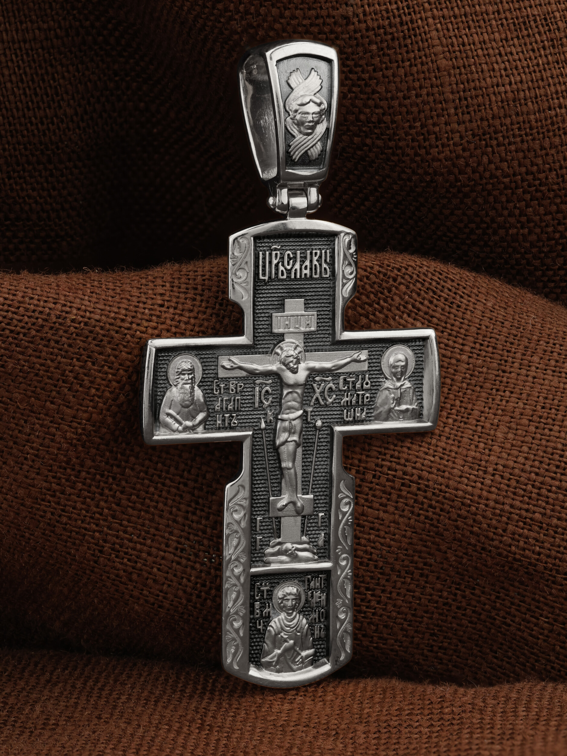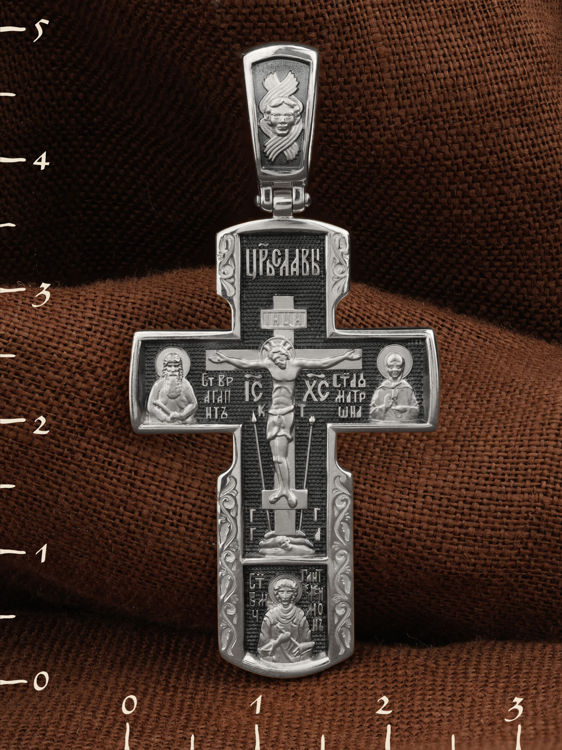 Как действенная помощь в немощах и болезнях был создан крест с образами святых целителей и со знаменитой афонской иконой Божией Матери «Всецарица». Над титлом видим слова «ЦРЬ СЛВЫ» — Царь Славы. Верхняя перекладина символизирует собой табличку с надписью «IHЦI» — Иисус Назарянин Царь Иудейский. Под перекладиной пишется сокращенно имя Спасителя «IC XC» — Иисус Христос. Возвышение, на котором стоит Крест, символизирует гору Голгофу, на которой произошло Распятие. У подножия Креста изображают прах Адама, обозначенный черепом. Справа от Распятия помещен образ прославленной святой блаженной Матроны. Слева — икона преподобный Агапита. Этот святой жил в пещерах Киево-Печерского монастыря в XI веке и бескорыстно врачевал мирян и монахов. У основания Креста Господня изображен великомученик Пантелеимон Целитель. Господь даровал удивительную силу его молитве. Ею он исцелял любые болезни и даже воскрешал умерших.