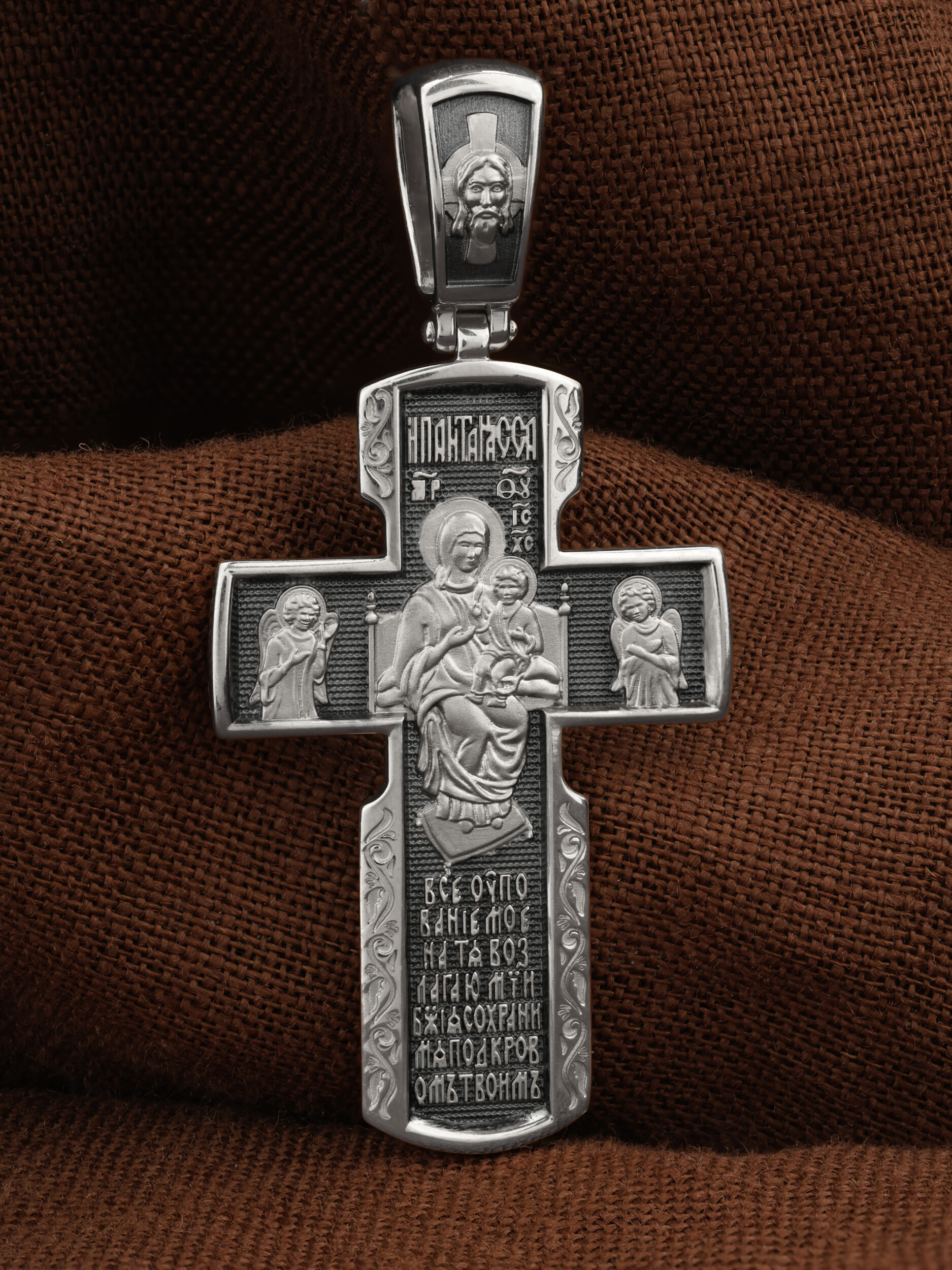 Весь оборот креста занимает икона Божией Матери «Всецарица». Внизу креста написана молитва обращенная к Божией Матери «Все упование мое на Тя возлагаю, Мати Божия, сохрани мя под кровом Твоим».