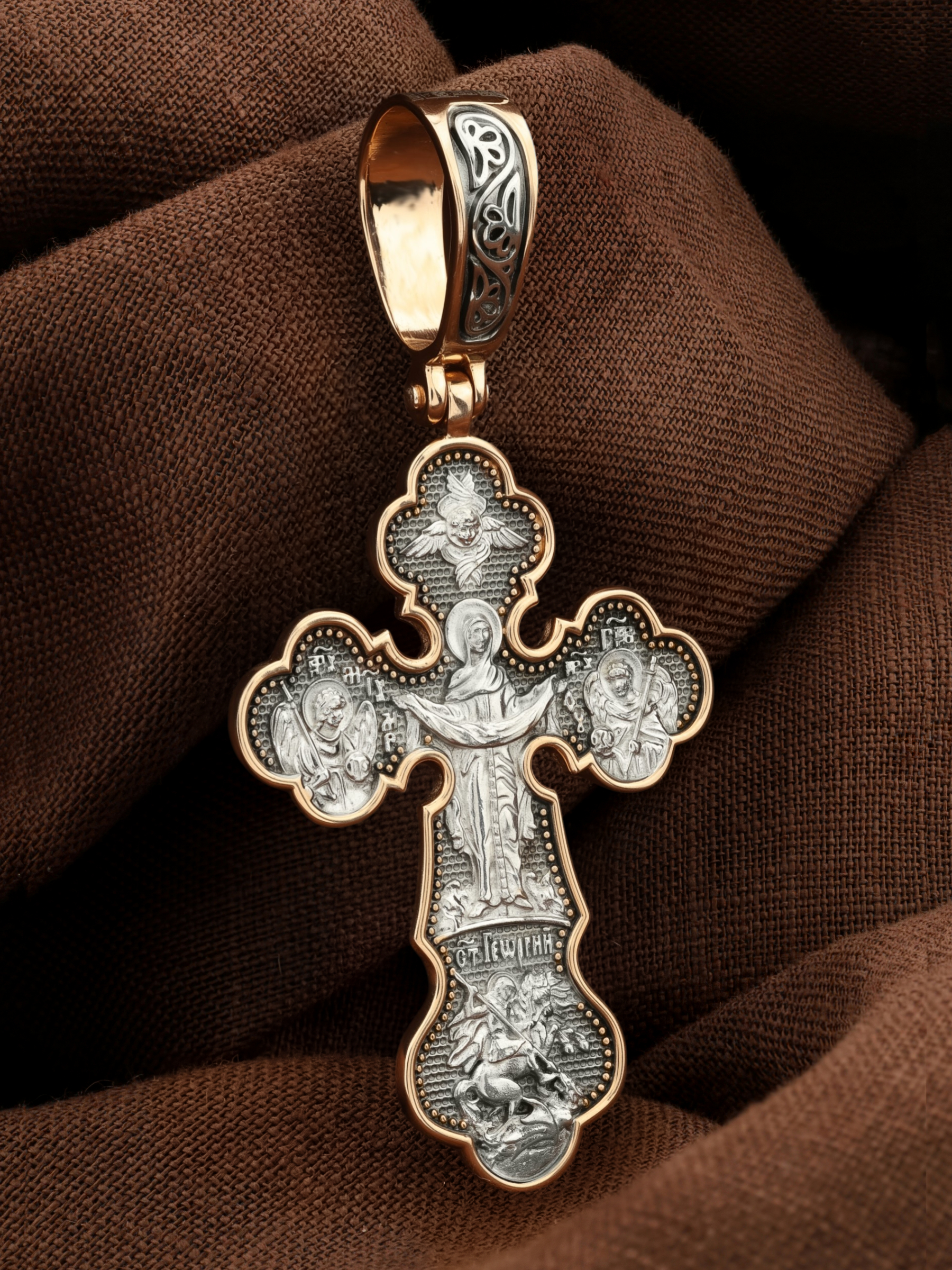 Центральную часть оборотной стороны креста украшает икона Божией Матери «Покров Пресвятой Богородицы». Праздник Покрова Пресвятой Богородицы пришел на Русь в XII веке из Византии и стал одним из самых почитаемых. Пресвятая Богородица простирает Свой молитвенный покров над всеми православными христианами и умоляет Сына своего о даровании вечного спасения каждому человеку. Над образом помещен шестикрылый Серафим. Справа помещено изображение Архангела Гавриила, слева- Архангела Михаила. На кресте внизу помещено изображение Святого Великомученика Георгия Победоносца — одного из самых почитаемых и удивительных святых. Он изображен как воитель, сидящий на вздыбленном коне и поражающий копьем огнедышащего змея. Змей символизирует собою сатанинские силы.