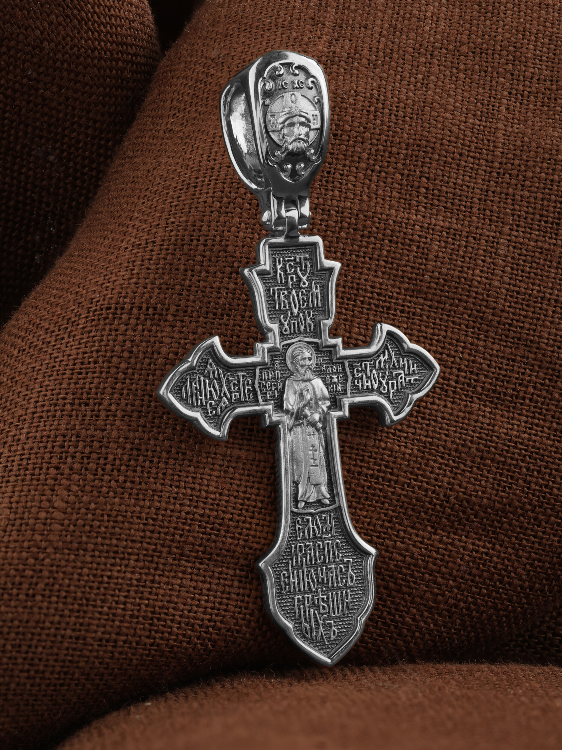 На лицевой стороне этого креста центральную часть занимает икона Распятия Христа — образ жертвы, принесенной Господом за грехи людей. Именно ко Христу, сошедшему на землю ради нашего спасения, возносятся все молитвы. Рядом с Его образом помещены слова — «НИКА» и «Царь Славы». Эти слова характеризуют Господа как Великого Архиерея, победителя смерти. Также Распятие сопровождается надписями, олицетворяющими Христа — это святое имя Христа «IC» (Иисус) «ХС» (Христос). Венчает лицевую сторону креста надпись «Царь Славы». На кулонном кольце помещено изображение Спаса Нерукотворного.