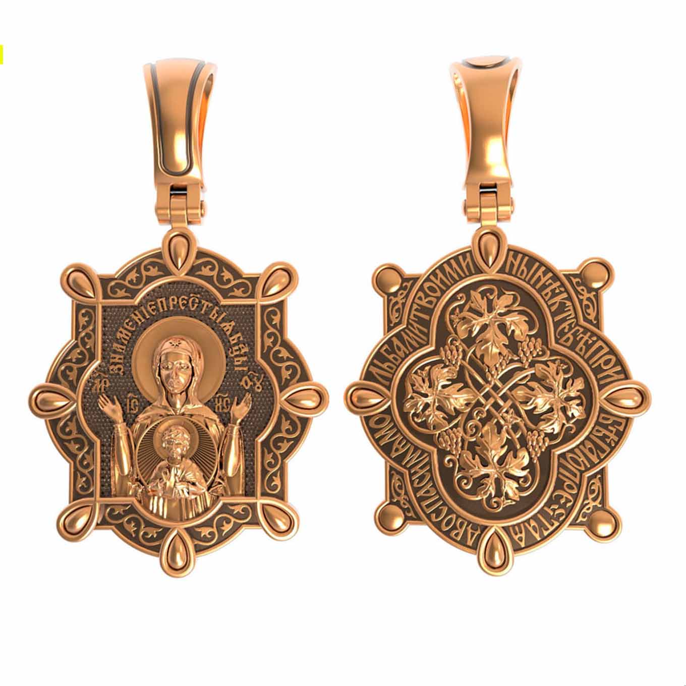 В центр образка помещен образ Божией Матери «Знамение», прославившийся многими чудесами в Новгороде в XII веке. Икона эта чтится как одна из самых великих святынь Русской земли. Молитвенно воздетые руки Богородицы означают заступничество за людей пред Богом. Рядом с Ней, на фоне круглого щита, — благословляющий Божественный Младенец — Спас-Эммануил.