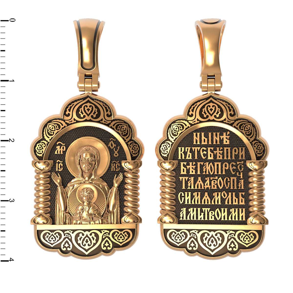 В центр образка помещен образ Божией Матери «Знамение», прославившийся многими чудесами в Новгороде в XII веке. Икона эта чтится как одна из самых великих святынь Русской земли. Молитвенно воздетые руки Богородицы означают заступничество за людей пред Богом. Рядом с Ней, на фоне круглого щита, — благословляющий Божественный Младенец — Спас-Эммануил.