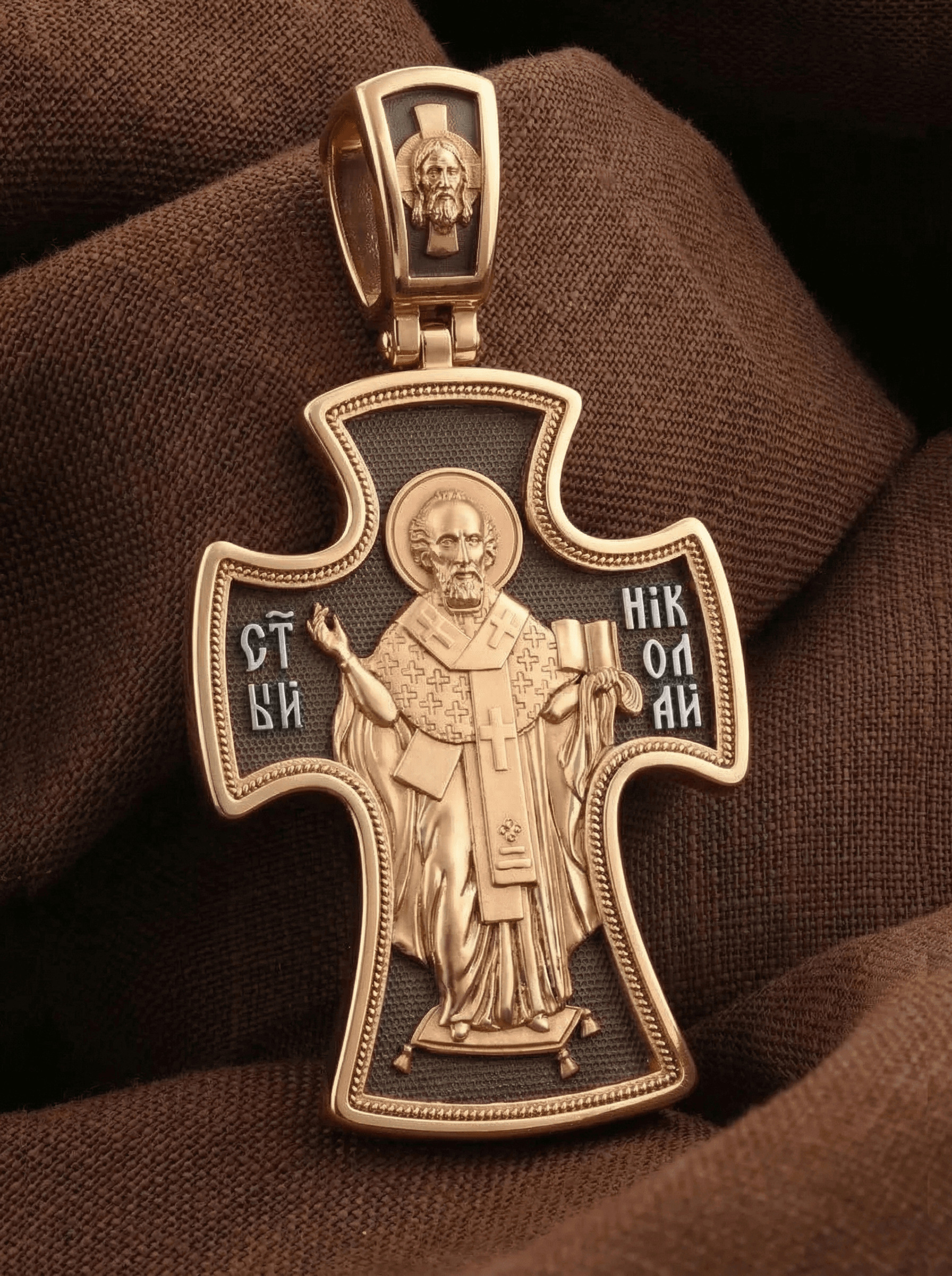 Оборотную сторону креста возглавляет икона святителя Николая Чудотворца, которого еще называют Николай Угодник за то, что он угодил своей жизнью Богу. Николай Чудотворец, помощник в делах, покровитель учащихся, утешитель обиженных. Также Святитель Николай Чудотворец известен своими молитвами за путешественников, когда непрестанный ветер и бушующие волны утихают и корабль заходит в спокойную гавань. На кулонном кольце изображен Спас Нерукотворный — Символ вочеловечившегося Божества и четырехкрылый Херувим.