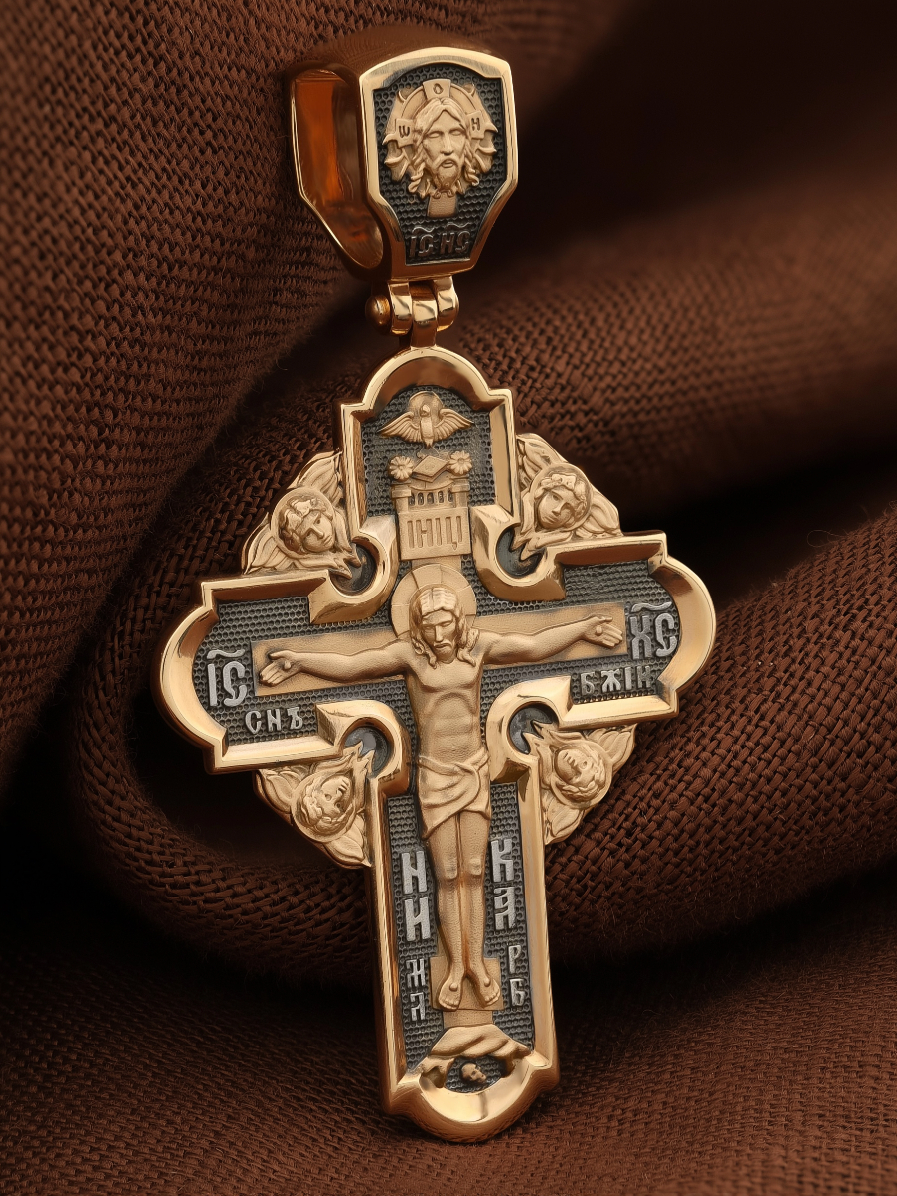На лицевой стороне креста изображено Распятие Господа и Спасителя нашего Иисуса Христа. Крест- символ спасения и искупления рода человеческого, знамение победы над смертью и адом. Верхняя перекладина символизирует титло — табличку, на которой, согласно Евангелию, было начертано: Иисус Назорей Царь Иудейский (IНЦI). Надпись «IC» «ХC», означает Иисус Христос, помещается на разных сторонах поперечной перекладины креста. Ниже перекладины расположено словосочетание «СЫН БОЖИЙ», что означает божественную природу Иисуса Христа. Надпись «МЛРБ» — «место лобное рай бысть» означает, что место лобное стало раем и помещаются в нижней части креста. Рядом — слово «НИКА», что означает «победитель». Возвышение, на котором стоит Крест, символизирует гору Голгофу, на которой произошло Распятие. Под подножием Креста изображена покоящаяся голова (череп) Адама. На кулонном кольце изображен Нерукотворный образ Господа и Спасителя нашего Иисуса Христа, чудесно отпечатавшийся на плате, которым Христос вытер свой лик.