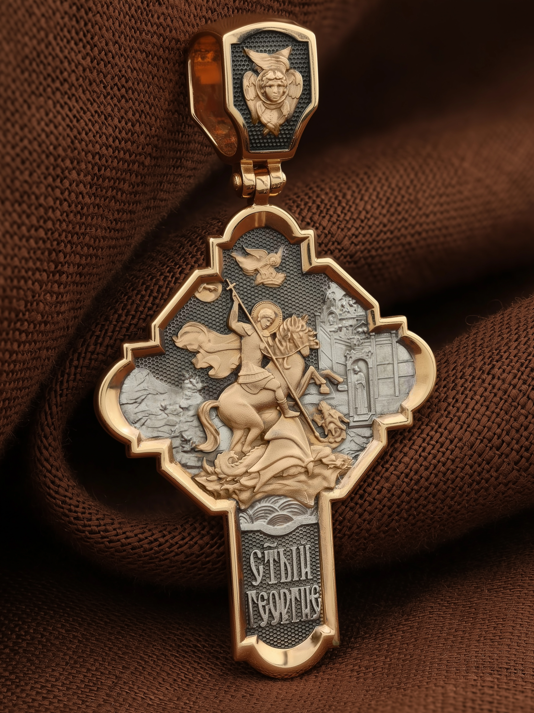 На оборотной стороне креста помещено изображение Святого Великомученика Георгия Победоносца — одного из самых почитаемых и удивительных святых. Георгий родился в Каппадокии (Малая Азия) в семье богатых и знатных горожан. Юношей поступил на службу к римскому императору Диоклетиану, за отличное знание военного дела и проявленную в боях и походах храбрость был приближен к императору и удостоен высокого воинского звания. Во время начавшихся гонений на христиан, перешел на сторону гонимых и, отвергнув человеческий страх, стал ярым проповедником учения Христа. Мучители подвергли опального воеводу жесточайшим восьмидневным пыткам и казнили его (обезглавили) в возрасте около тридцати лет в 303 году. Георгий изображен как воитель, сидящий на вздыбленном коне и поражающий копьем огнедышащего змея. Слева над образом изображена благословляющая Божия десница. Над святым изображен ангел возлагающий на него венец мученика. Змей символизирует собою сатанинские силы. Молитвами вознесенными к Всевышнему и своей непреклонной верой он смог одолеть чудовище. Святой убил змея, спас царскую дочь, принесенную в жертву, и жителей города, их души от влияния дьявола, породив в них надежду и веру в Господа, призывая людей принять христианскую веру. На кулонном кольце изображен шестикрылый Ангел — Серафим.