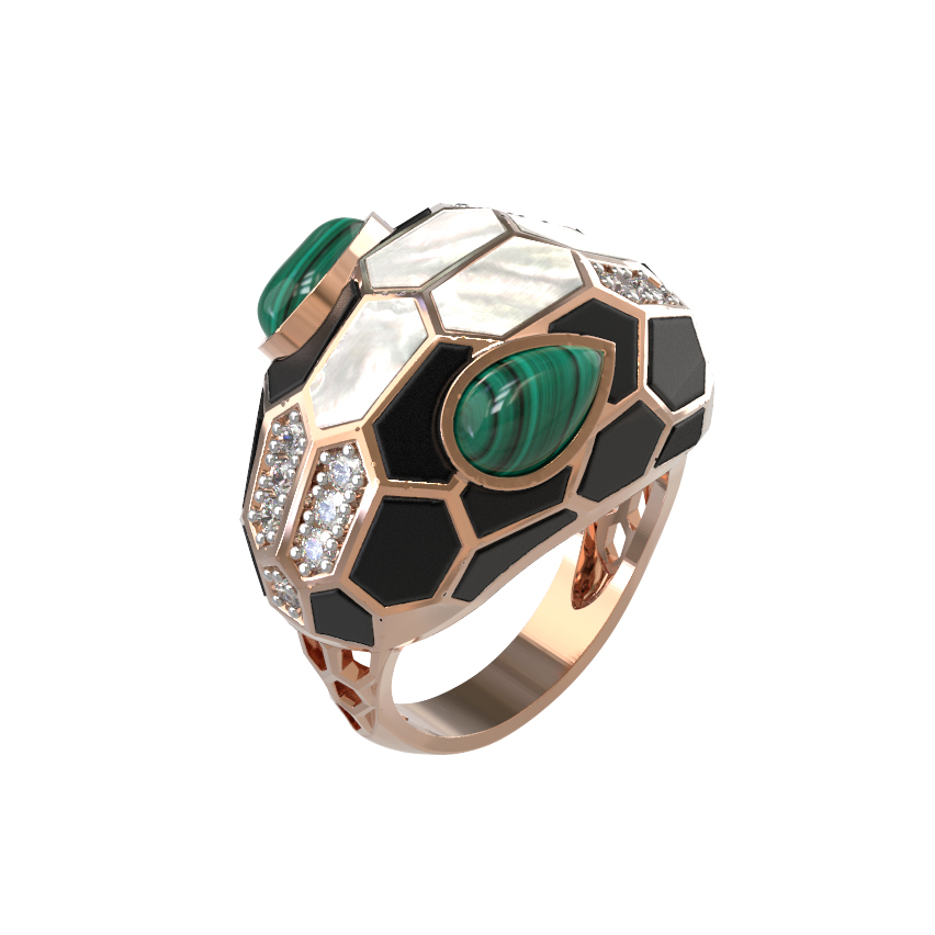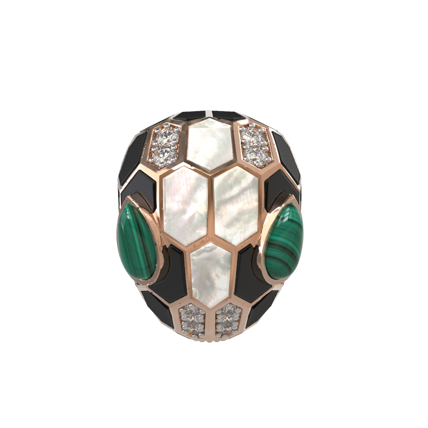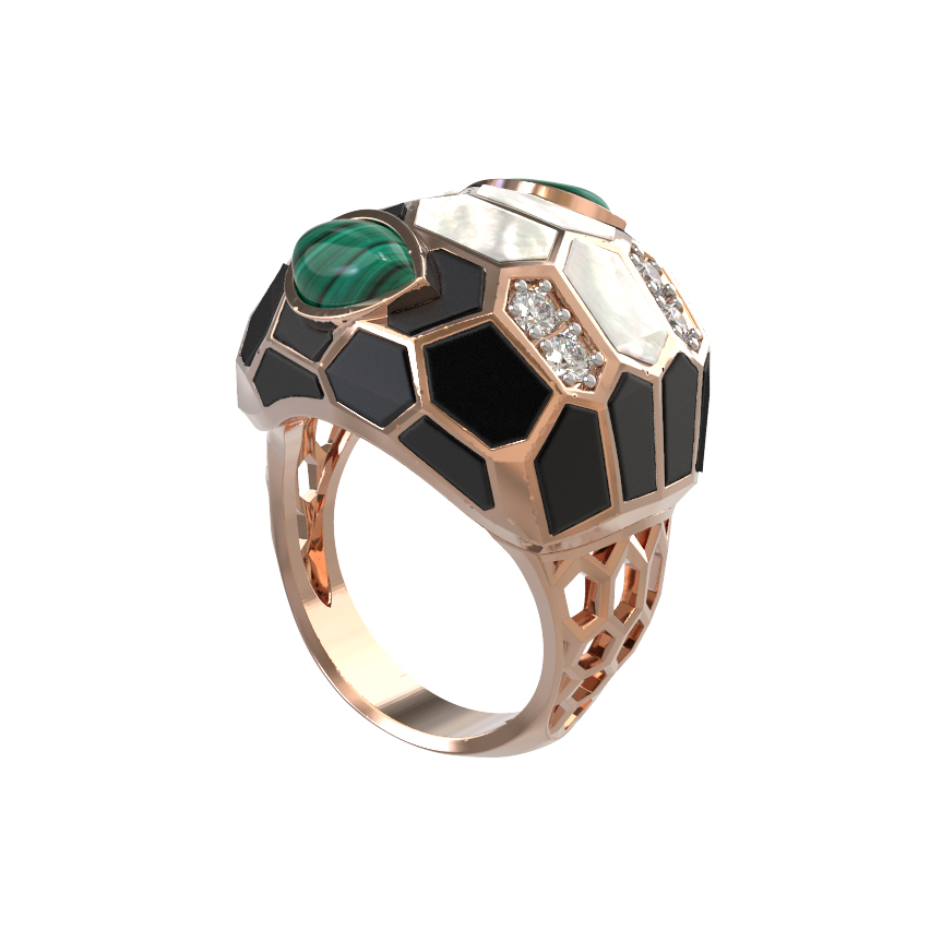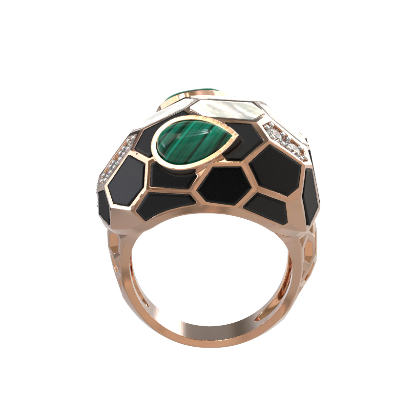 Кольцо из золота c бриллиантами, рубином, ониксом, малахитом и перламутром