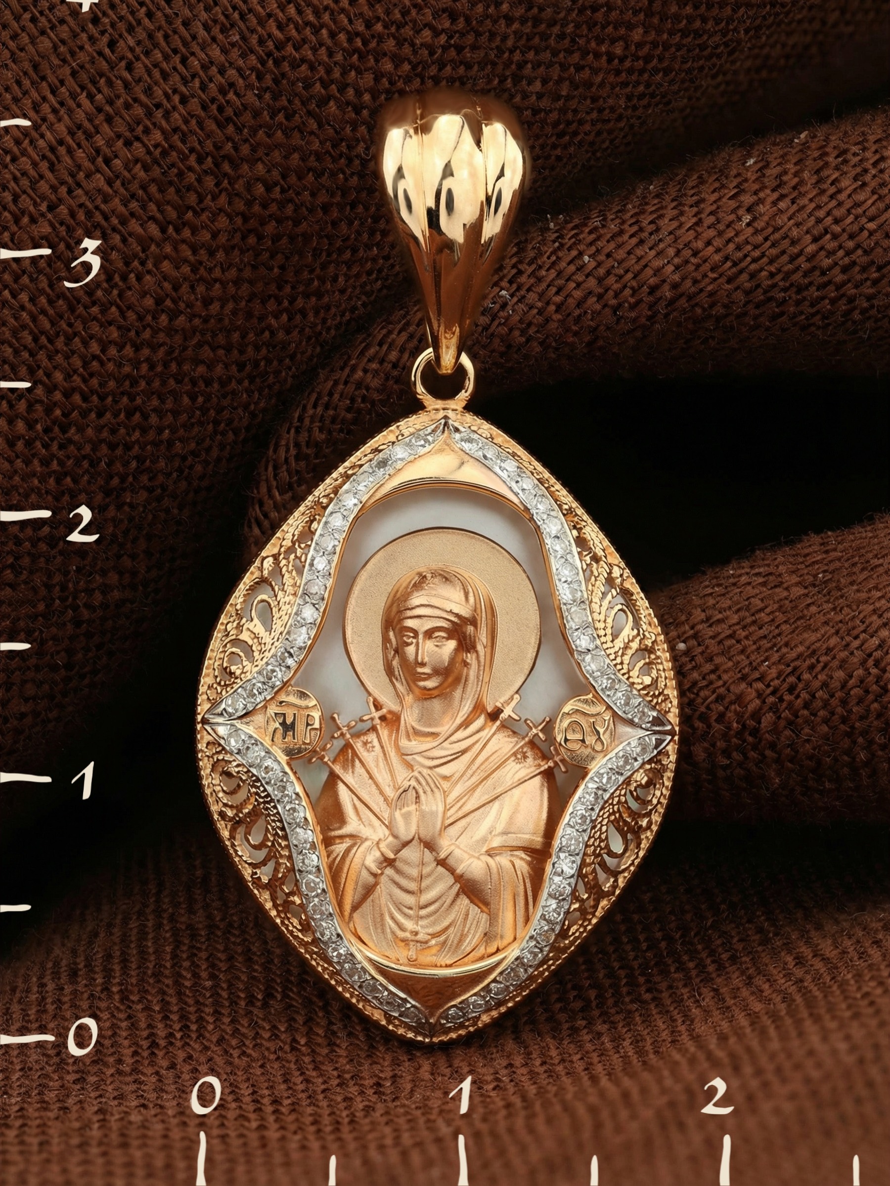 На лицевой стороне образка изображена икона Пресвятой Богородицы «Семистрельная» — одна из самых чудотворных икон на Руси. На протяжении многих веков христиане взывали к Царице Небесной через эту икону, если в стране начинались войны или мятежи. Пресвятая Богородица символически изображена пронзенной семью стрелами. Это образ скорби Матери, увидевшей страдания Своего Сына. Подобно тому, как Тело Христа пронзили гвоздями и копием, так и душу Пречистой Его Матери поразило «оружие» печали и сердечной боли. По учению Православной Церкви Господь был распят за грехи людей, и каждый день вновь распинается на Литургии за новые грехи ныне живущих. Поэтому семь стрел символически означают также семь смертных грехов человеческих, приносящих Богородице новые скорби.