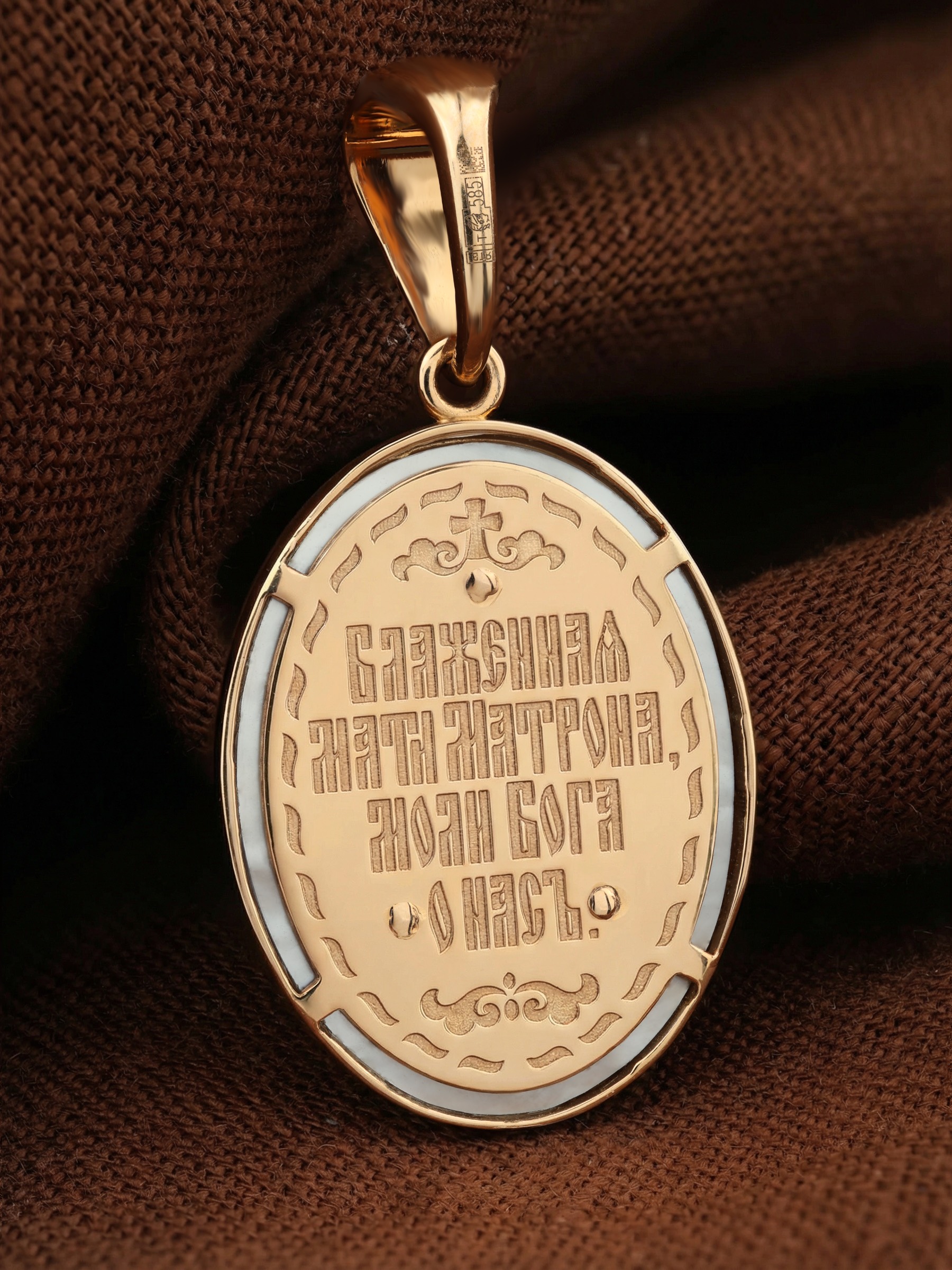 На лицевой стороне образка изображена Святая Матрона Московская. Родилась блаженная Матрона в 1881 г. в бедной, но благочестивой крестьянской семье. Кроме Матроны в семье уже было трое детей: двое братьев и сестра. Мать Матроны хотела отдать будущего ребенка в приют, но увидев вещий сон, отказалась от этой мысли. Дочь родилась слепой, но мать любила свое «дитя-несчастное». Уже с восьми лет Матрона имела глубокую веру, способность исцелять больных и предсказывать будущее. Она чувствовала приближение опасности, предвидела стихийные и общественные бедствия. По ее молитве люди получали исцеление от болезней и утешение в скорбях. В возрасте около 17 лет у неё отнялись ноги. Сама Матрона знала, что так должно было случиться, и приняла это как волю Божию. Блаженная Матрона Московская является одной из самых известных и почитаемых в России святых. Считается, что по молитвам святой Матроны происходит огромное количество чудес и исцелений. Поклониться святой Матроне приезжают паломники из других стран. Патриарх Московский и всея Руси Кирилл призывал всех обращаться к святой Матроне не только за помощью в решении жизненных проблем, но и даровании сил несения страданий.