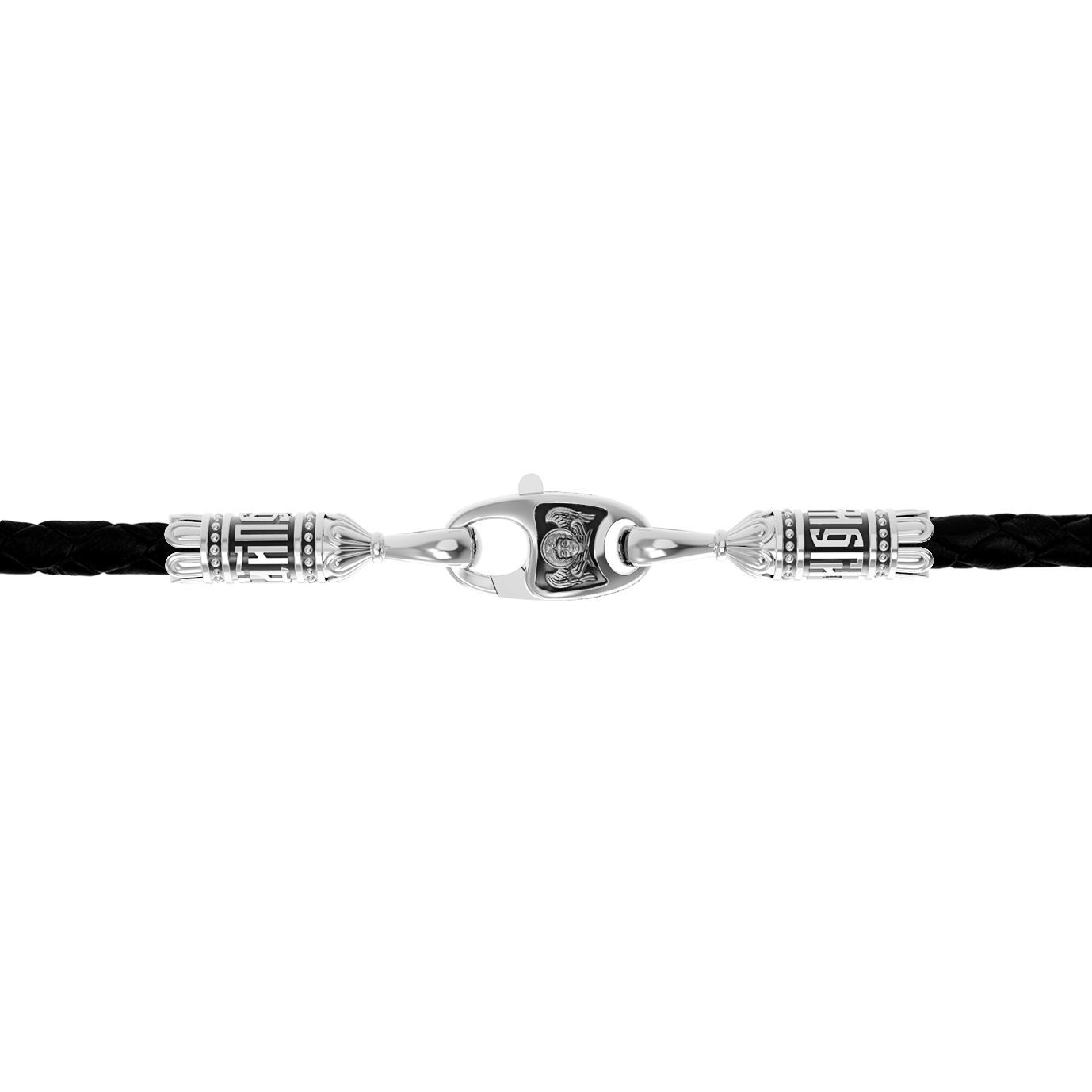 На концах цепи-шнурка расположены концевики с надписью: «Спаси и сохрани». Соединяет концевики замочек-карабин в форме рыбки. На замочке изображен шестикрылый Серафим.