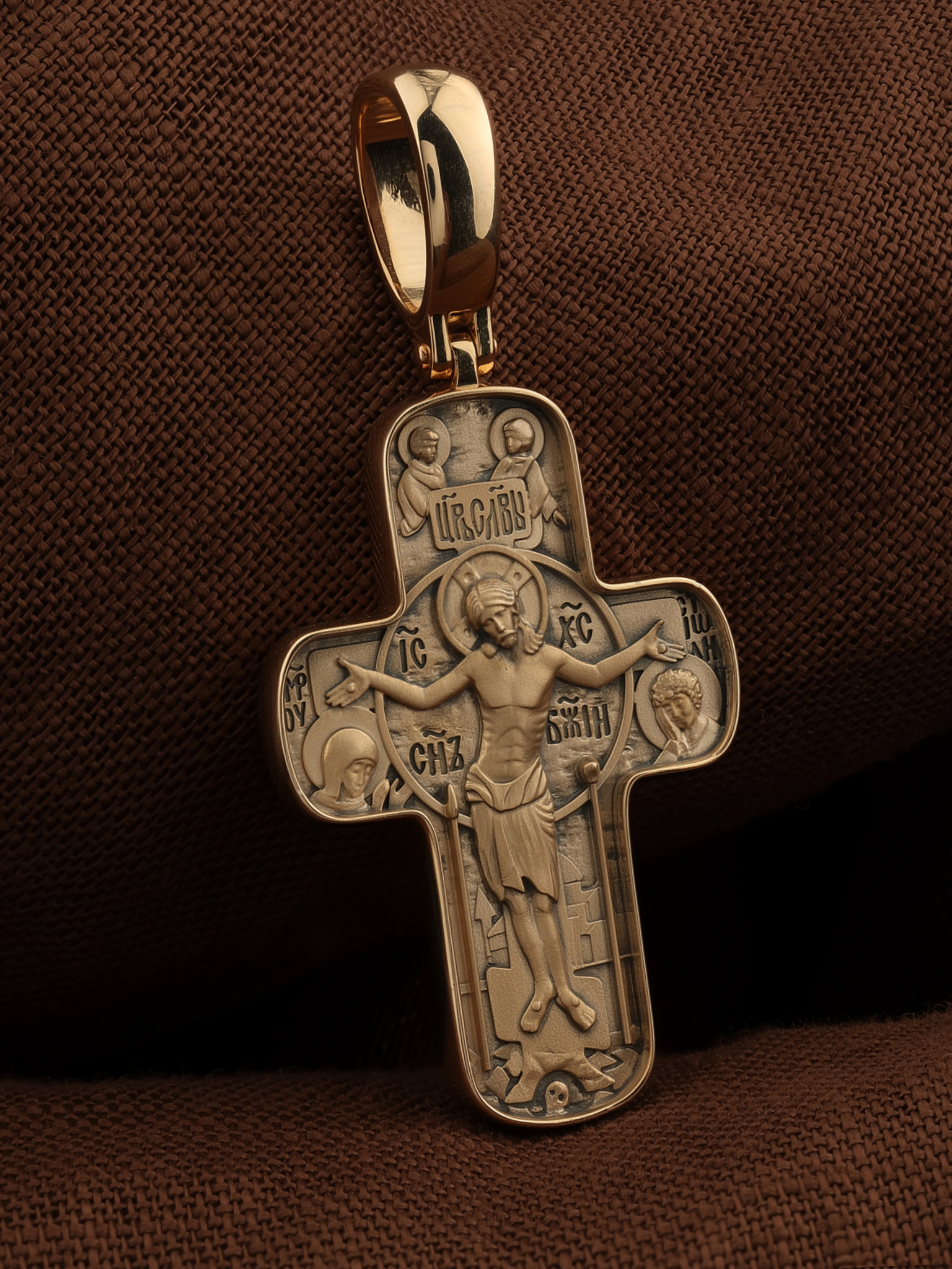 На лицевой стороне креста изображено Распятие Господа и Спасителя нашего Иисуса Христа. Христос, подвергнутый на кресте мучительной казни, своими страданиями искупил нас от древнего греха и даровал нам жизнь вечную. Без Распятия не было бы Воскресения Христова, и поэтому Крест из орудия казни обратился в святыню, в которой действует Благодать Божия. Над Распятием помещена надпись «Царь Славы». Распятие сопровождается надписями, олицетворяющими Христа: «IС» « ХС», что означает Иисус Христос и «Сын Божий». Над вершиной Распятия помещены изображения Ангелов.. Слева от Распятия изображена Пресвятая Богородица, справа — апостол и евангелист Иоанн Богослов, один из ближайших учеников Иисуса Христа. Возвышение, на котором стоит Крест, символизирует гору Голгофу, на которой произошло Распятие. Под подножием Креста изображена покоящаяся голова (череп) Адама