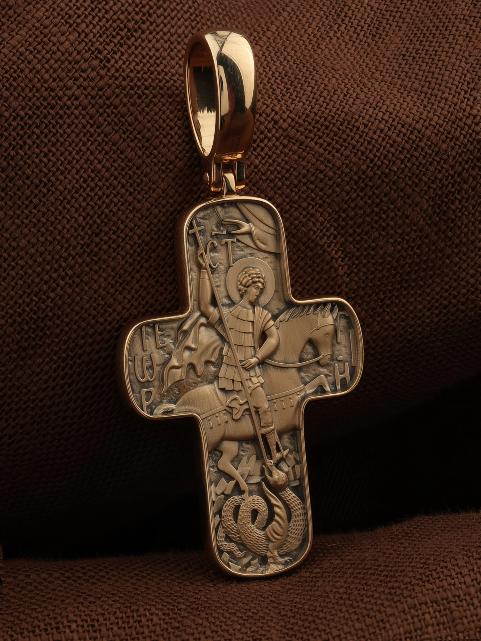 Основой композиции оборотной стороны креста является изображение Святого Великомученика Георгия Победоносца — одного из самых почитаемых и удивительных святых. На Руси он известен как Юрий или Егорий, покровитель воинов, помощник в крестьянском труде. На образке он изображен как воитель, сидящий на коне и поражающий копьем огнедышащего змея. Змей символизирует собою сатанинские силы. Молитвами вознесенными к Всевышнему и своей непреклонной верой он смог одолеть чудовище.. Над образом изображена благословляющая Божия десница.