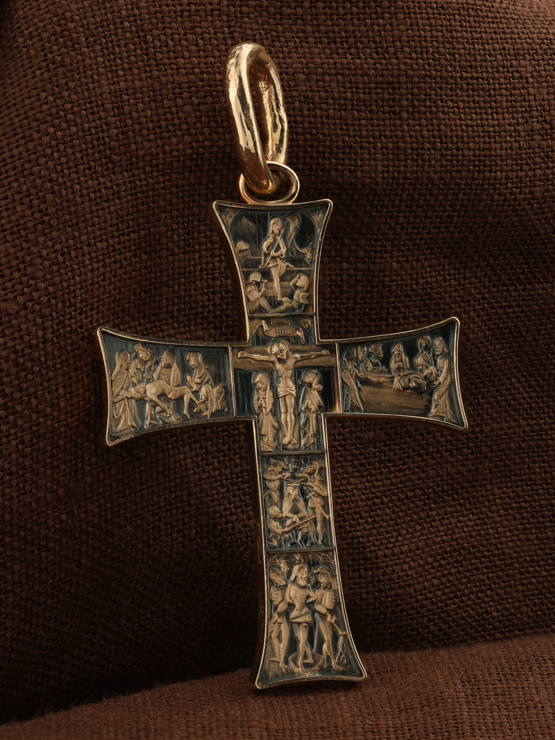 На лицевой стороне креста изображены Крестные Страдания и Воскресение Господа и Спасителя нашего Иисуса Христа. Крест- символ спасения и искупления рода человеческого, знамение победы над смертью и адом. Иисус Христос, как искупительная жертва освобождения человечества от власти греха, умер крестной смертью и в третий день воскрес. В центре креста изображено Распятие Иисуса Христа на Кресте. Ниже — взятие под стражу, а также пытки и мучения Христа перед Распятием. Слева от Распятия изображено снятие Господа с Креста, справа — положение во гроб. Над Распятием отображен образ Воскресшего из гроба Господа и Спасителя нашего Иисуса Христа.