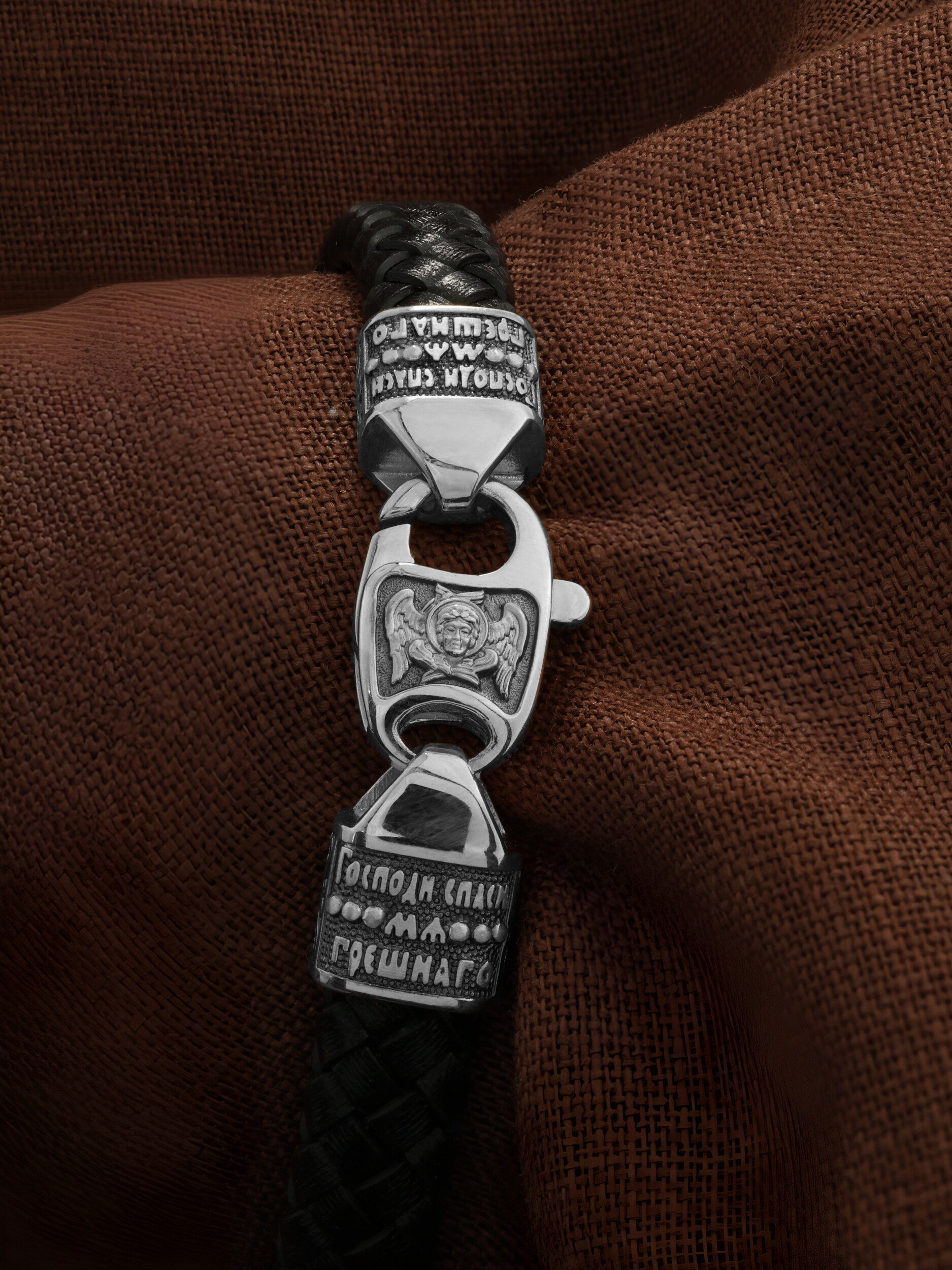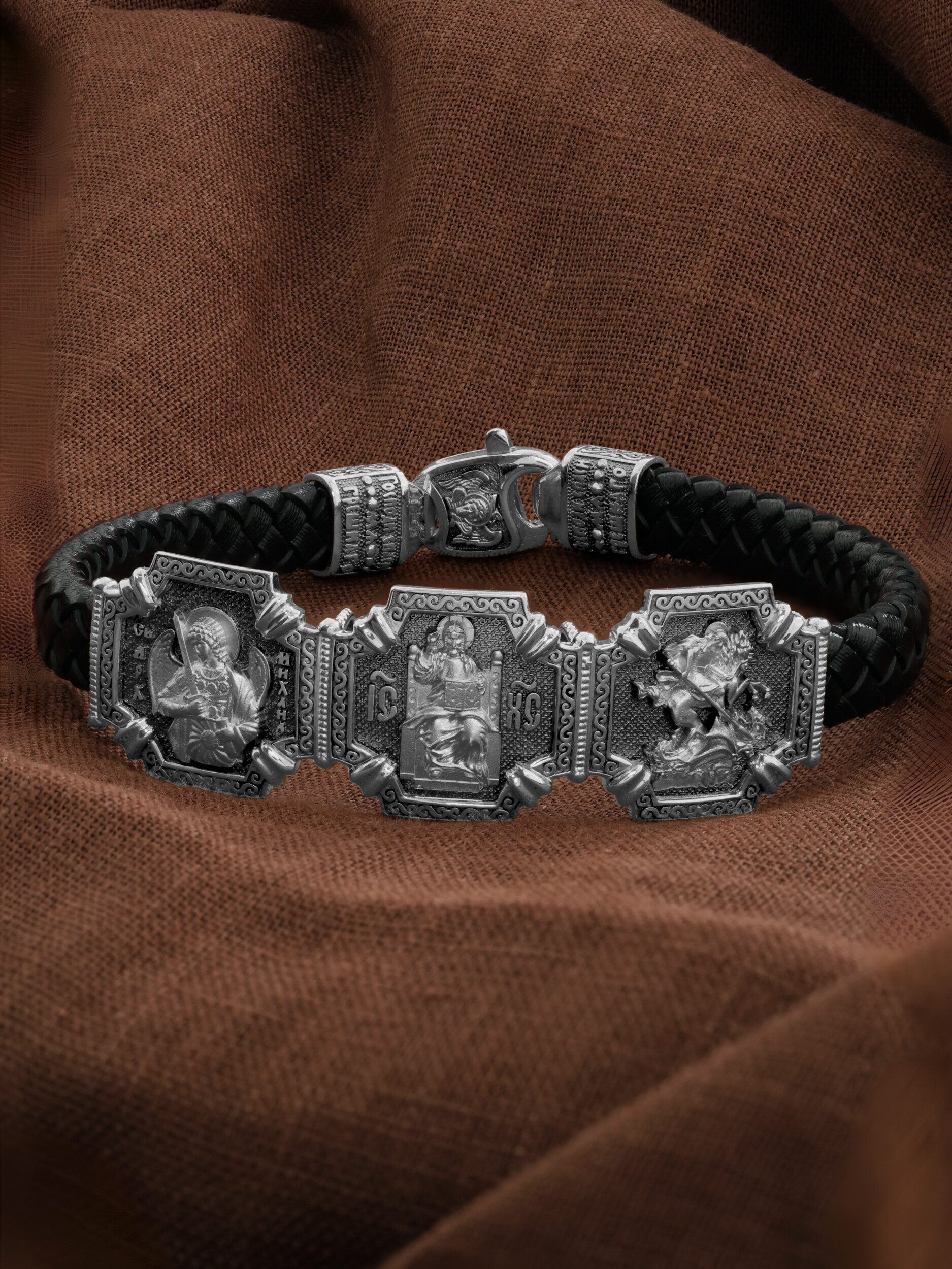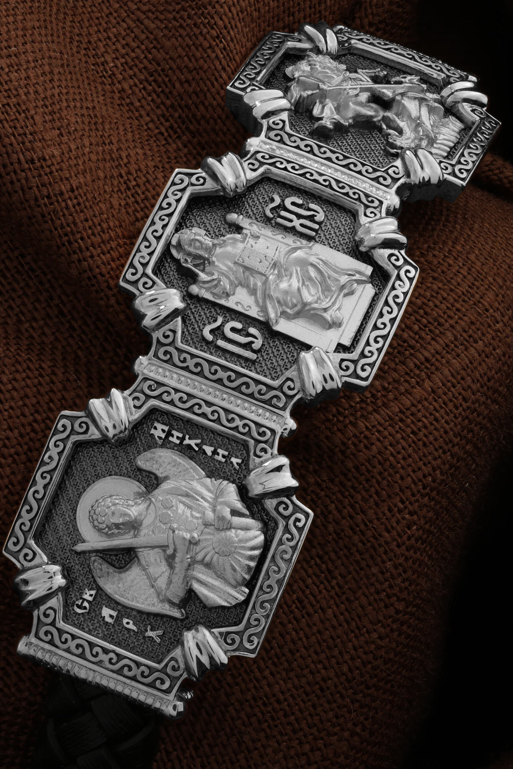 Композиционным центром браслета является Иисус Христос в образе Вседержителя, по-гречески «Пантократор». Это древнейший образ Спасителя, на котором Он представлен как властелин и правитель мира. Христос держит в руках Книгу, которая символизирует Книгу Бытия, то есть весь сотворенный Богом мир. В этой Книге судьбы всех людей, живущих на земле. Слева от образа Вседержителя — икона Архангела Михаила — Архистратига всех Небесных Воинств. Он ведет непримиримую войну против сил зла, охраняет райские врата и защищает души людей. Его имя означает «Кто яко Бог?», так как он самый могучий и грозный враг зла. Он первым ополчился на Денницу, когда тот восстал против Бога, низверг его с Неба и не перестает сражаться с его темным воинством. Поэтому он часто изображается в виде воина, в доспехах и с огненным мечом. Справа от образа Вседержителя — Великомученик Георгий Победоносец. Образ Великомученика считают одним из наиболее чтимых святынь в Святыни Православных, он олицетворяет собой заступника для верующих, чья жизнь имеет какое-либо отношение к военным делам, также он может оберегать и землевладельцев. Одно из самых великих чудес которое сотворил Великомученик так это — спасения всего города от устрашающего змия. Молитвами и своей непреклонной верой, взываемой к Всевышнему, он смог одолеть чудовище. Святой убил змея, спас жителей и их души от влияния дьявола, породив в них надежду и веру в Господа, призывая людей принять христианскую веру. Поскольку при жизни Святой Георгий был военным, он считается покровителем всех, кто имеет отношение к армии — военнослужащим, участникам боевых действий. Молитва перед иконой Георгия Победоносца поможет защититься от врагов, одержать победу в сражении (военном, спортивном, духовной брани с дьяволом), содействие в установлении мир