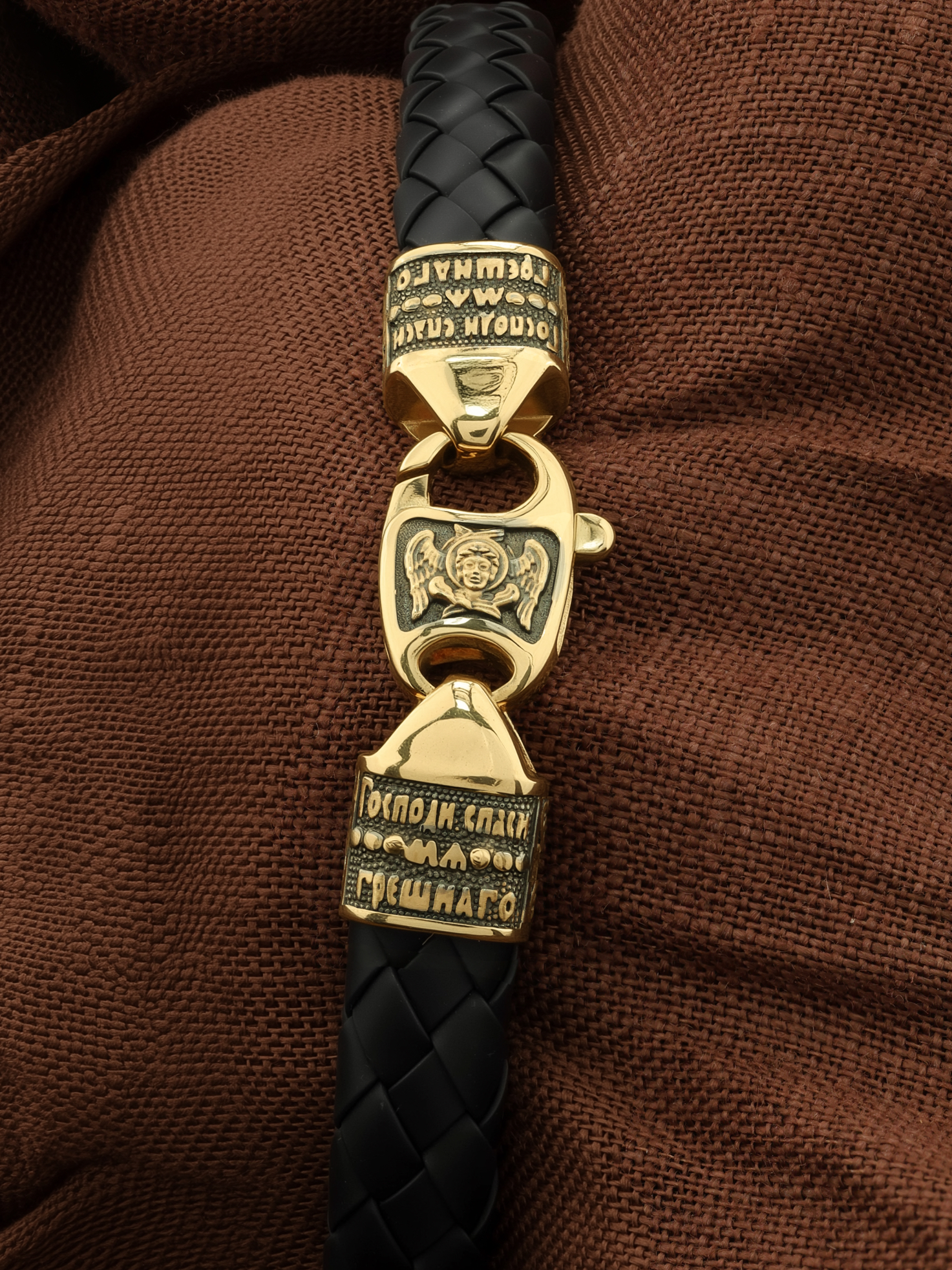На концевиках расположена молитва: «Господи, спаси мя грешного». Соединяет концевики замочек-карабин, на котором изображен шестикрылый Серафим.