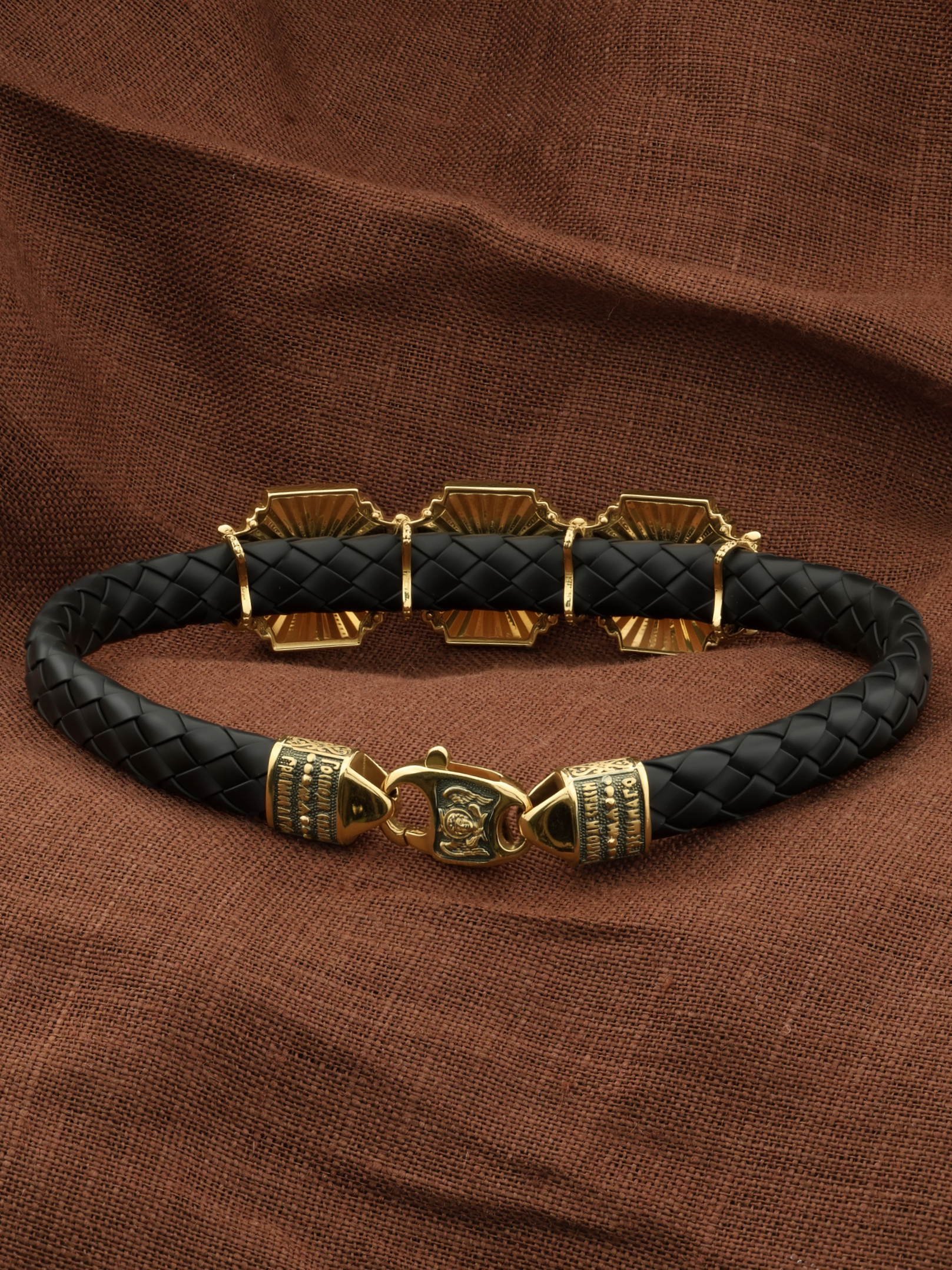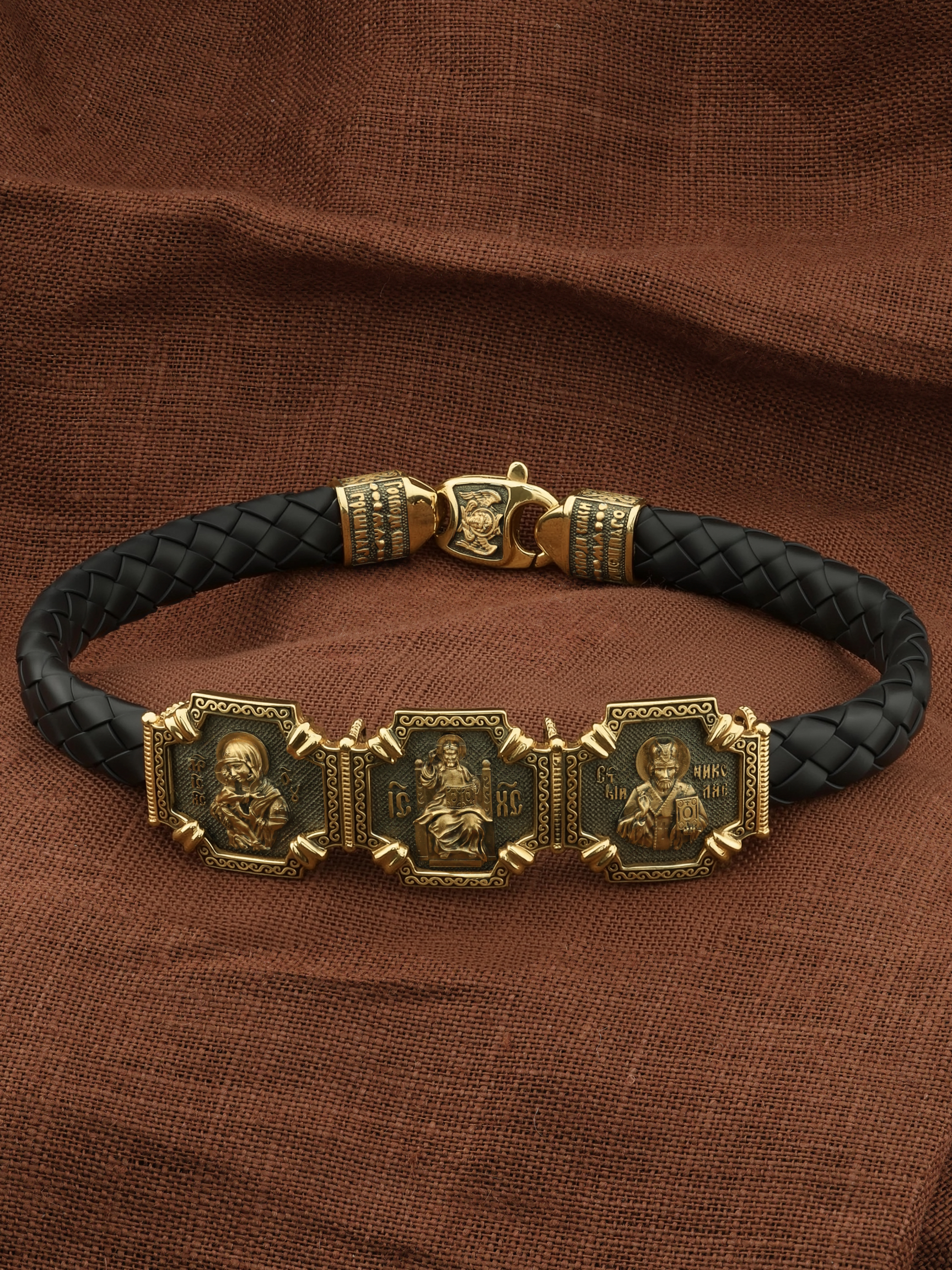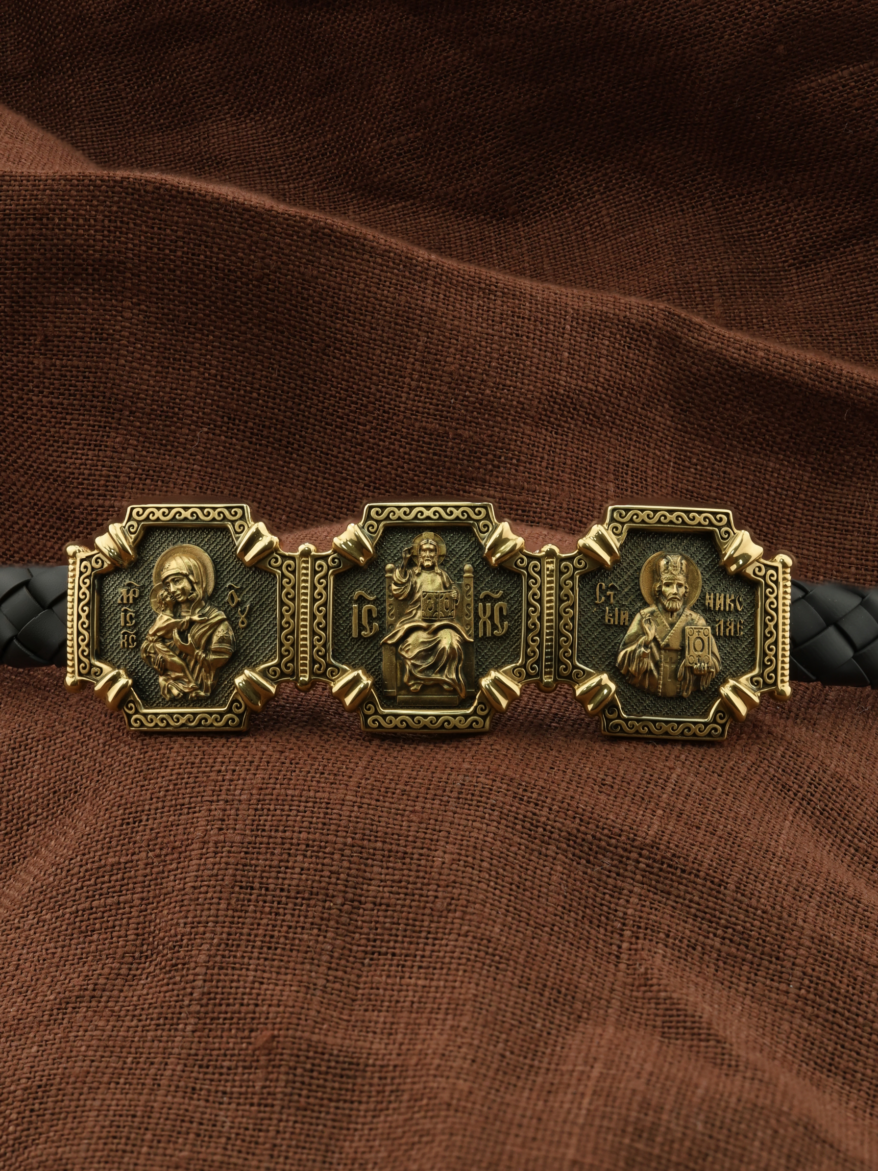 Композиционным центром браслета является Иисус Христос в образе Вседержителя. Это древнейший образ Спасителя, на котором Он представлен как властелин и правитель мира. Христос держит в руках Книгу, которая символизирует Книгу Бытия. В этой Книге судьбы всех людей, живущих на земле. Слева от образа Вседержителя — Владимирская икона Божией Матери. По преданию, была написана на доске трапезного стола из дома Иисуса Христа. На Русь Владимирская икона Божией Матери была привезена в начале XII века и с тех пор почитается как главная святыня нашего Отечества. Перед ней молитвенно просят Богородицу об исцелении от телесных недугов, в частности, заболеваний сердца и сердечнососудистой системы. За помощью к ней обращаются во время бедствий, когда нуждаются в защите от врагов. Справа от образа Вседержителя изображена икона Святого Николая Чудотворца. Живший в III веке епископ Ликийского города Миры — самый почитаемый святой не только в России, но и во всем мире. Николай Чудотворец — помощник в делах, защитник путешествующих, покровитель учащихся, утешитель обиженных и нуждающихся, целитель самых страшных и тяжелых недугов, представитель и молитвенник за людей перед Богом.
