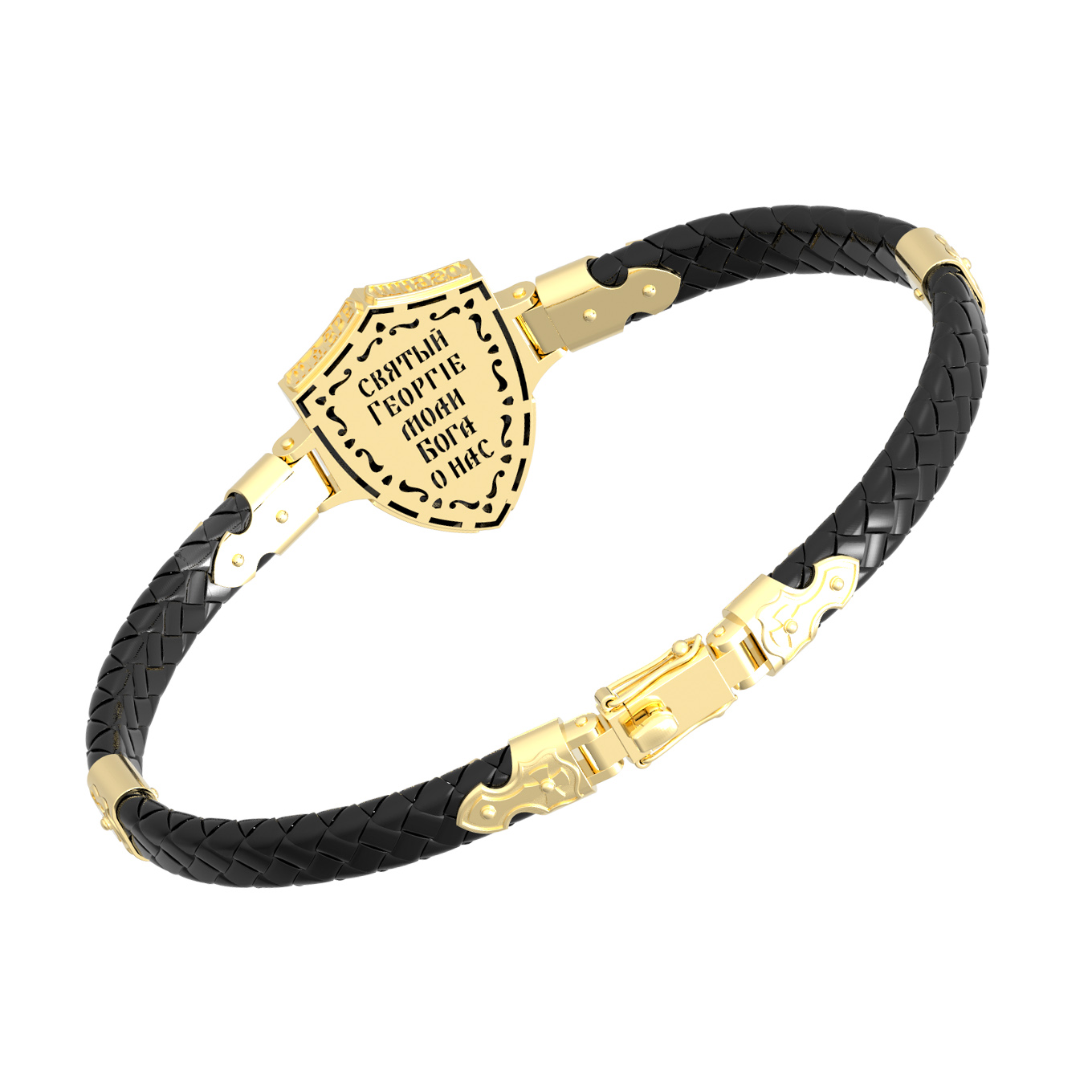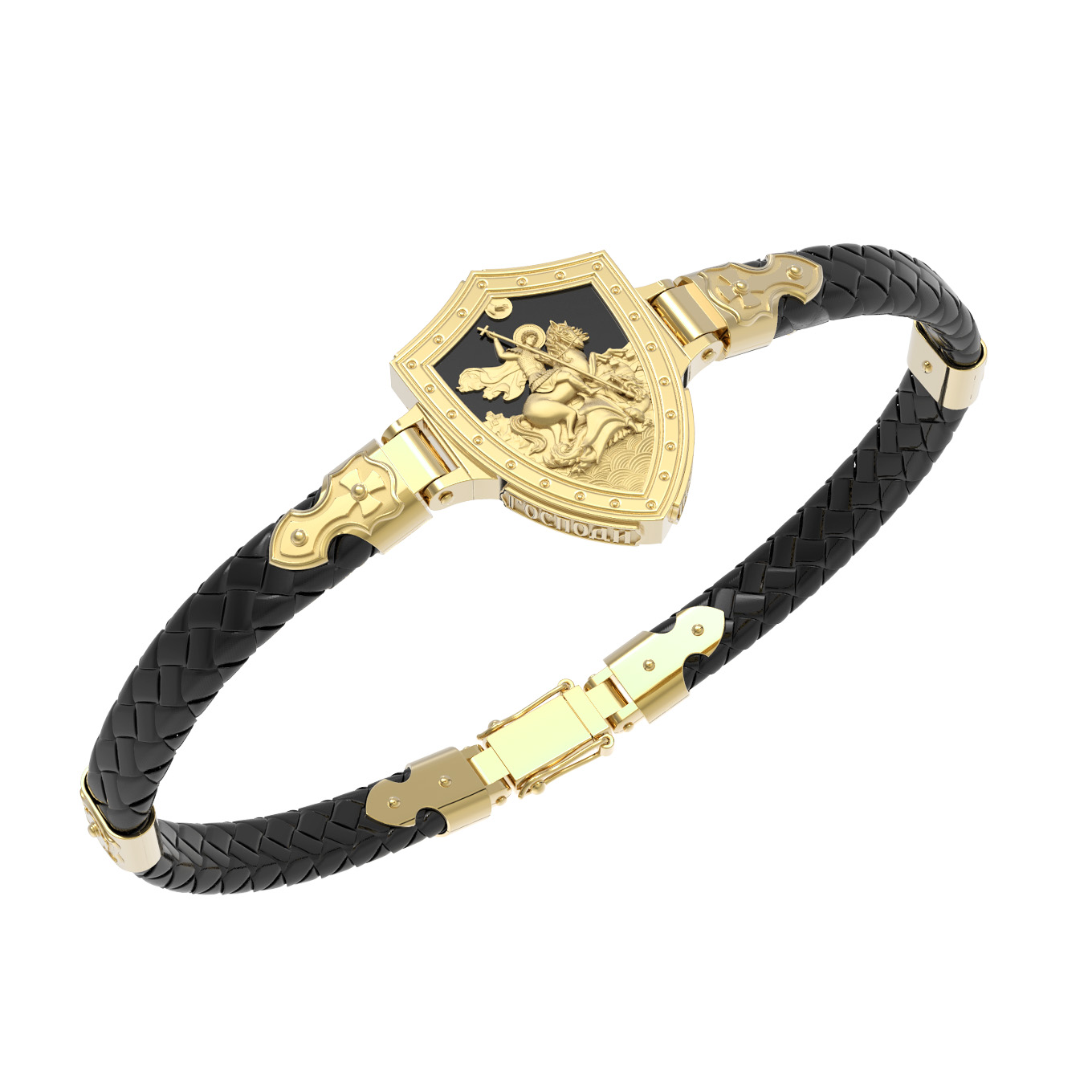 Основой композиции лицевой стороны браслета является изображение Святого Великомученика Георгия Победоносца — одного из самых почитаемых и удивительных святых. Георгий родился в Каппадокии (Малая Азия) в семье богатых и знатных горожан. Юношей поступил на службу к римскому императору Диоклетиану, за отличное знание военного дела и проявленную в боях и походах храбрость был приближен к императору и удостоен высокого воинского звания. Во время начавшихся гонений на христиан, перешел на сторону гонимых и, отвергнув человеческий страх, стал ярым проповедником учения Христа. Мучители подвергли опального воеводу жесточайшим восьмидневным пыткам и казнили его (обезглавили) в возрасте около тридцати лет в 303 году. На Руси он известен как Юрий или Егорий, заступник для верующих, чья жизнь имеет какое-либо отношение к военным делам, помощник в крестьянском труде. Браслет сделан в виде воинского щита. На нем Георгий изображен как воитель, сидящий на вздыбленном коне и поражающий копьем огнедышащего змея. Над образом изображена благословляющая Божия десница. Змей символизирует собою сатанинские силы. Молитвами вознесенными к Всевышнему и своей непреклонной верой он смог одолеть чудовище. Святой убил змея, спас царскую дочь, принесенную в жертву, и жителей города, их души от влияния дьявола, породив в них надежду и веру в Господа, призывая людей принять христианскую веру. На торце изделия помещена молитва: «Господи, помилуй мя грешного».