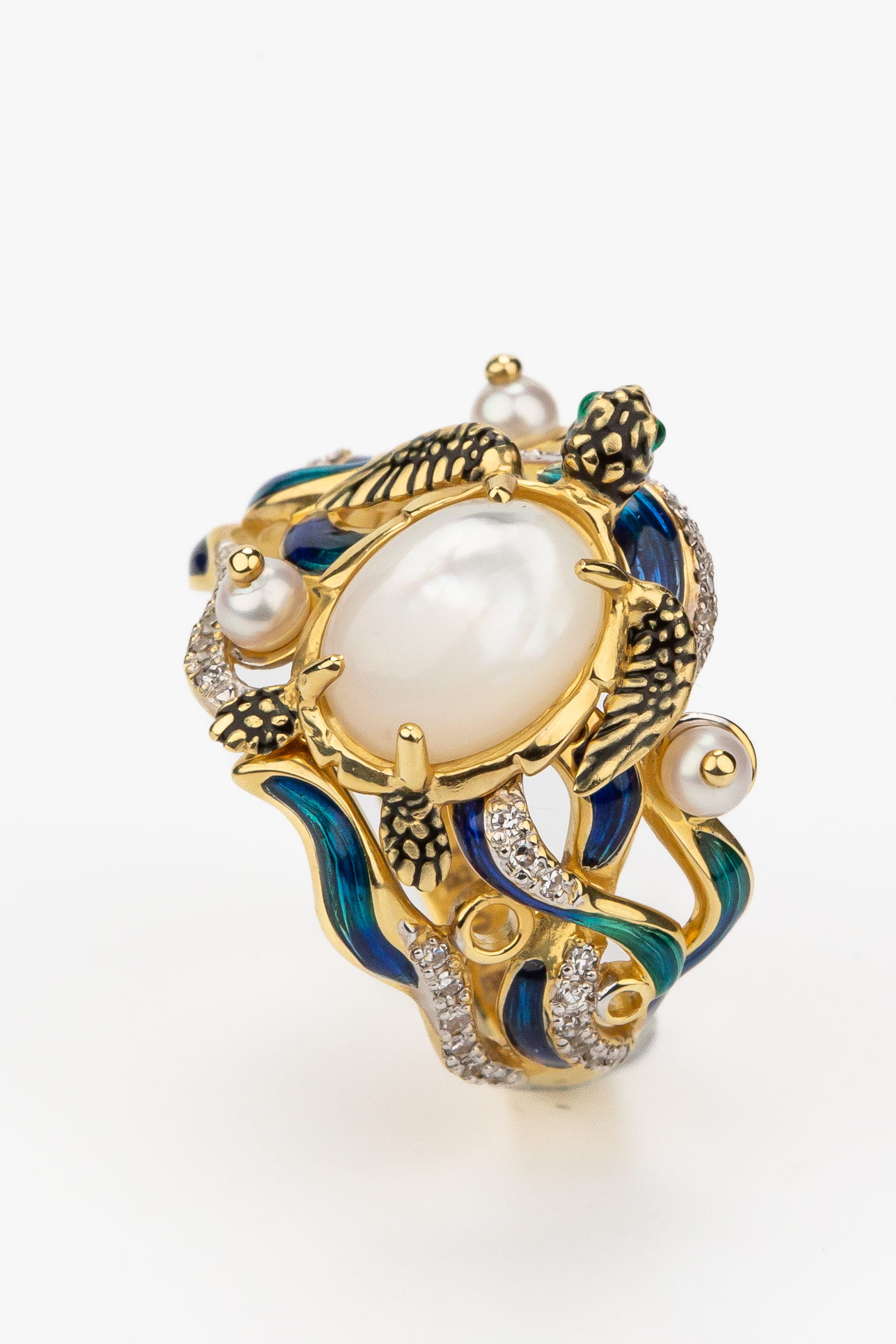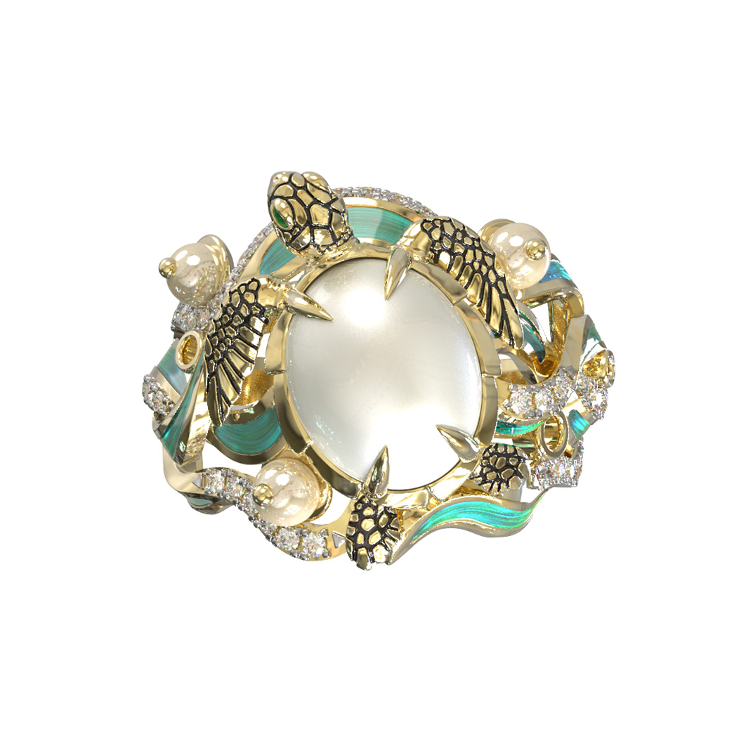 Кольцо из лимонного золота c эмаль, бриллиантами, жемчугом и перламутром