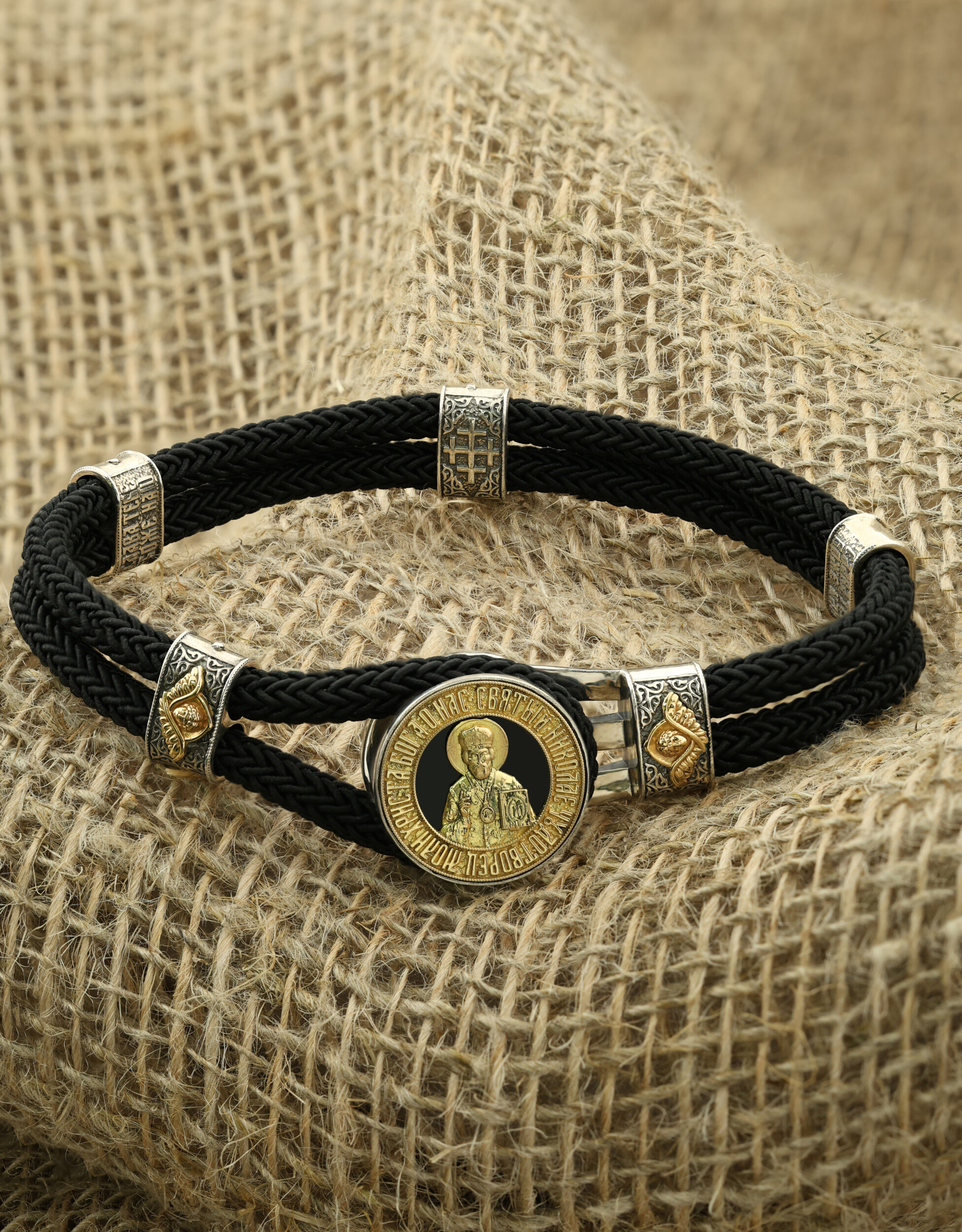 Браслет из серебра и золота c ониксом и шёлковым шнурком
