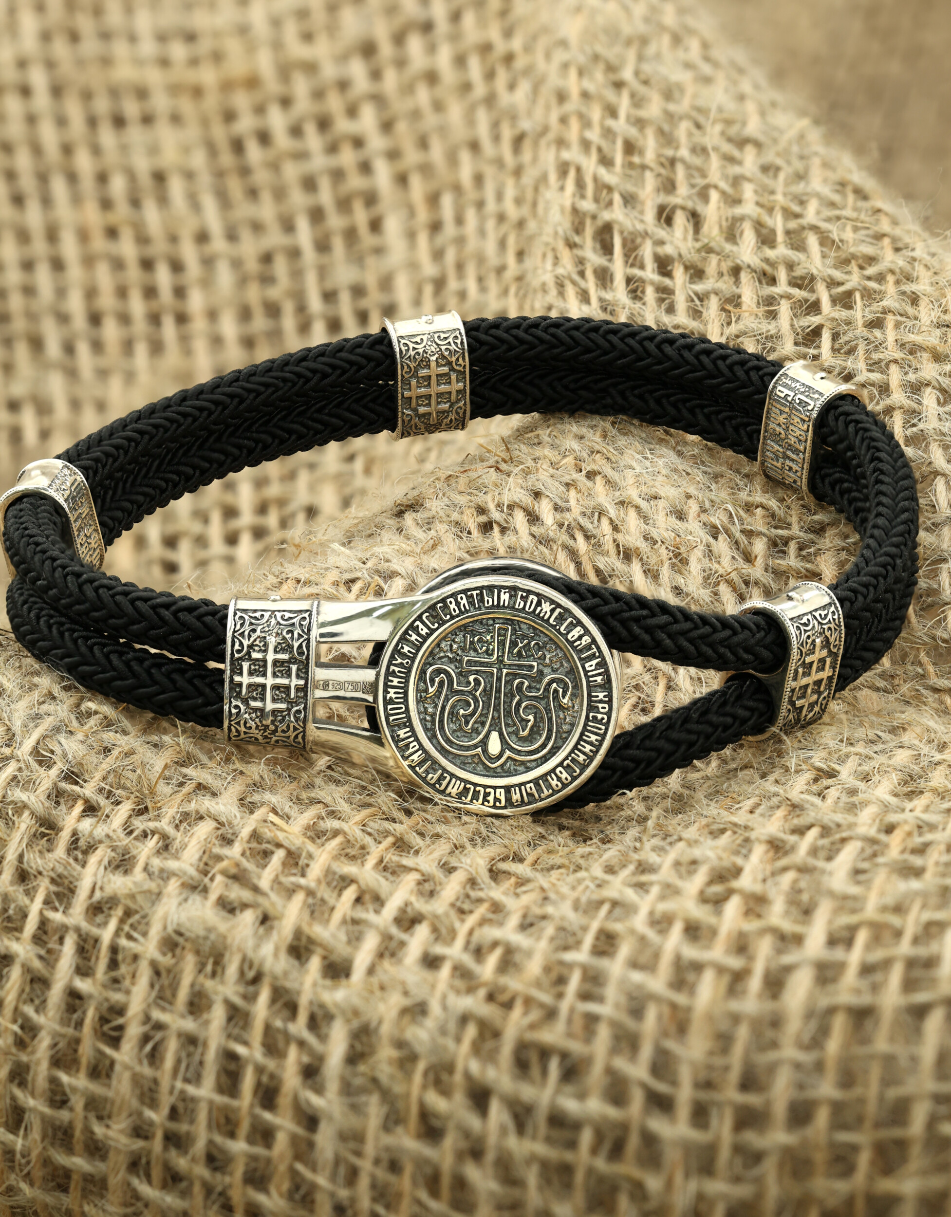 Браслет из серебра и золота c ониксом и шёлковым шнурком