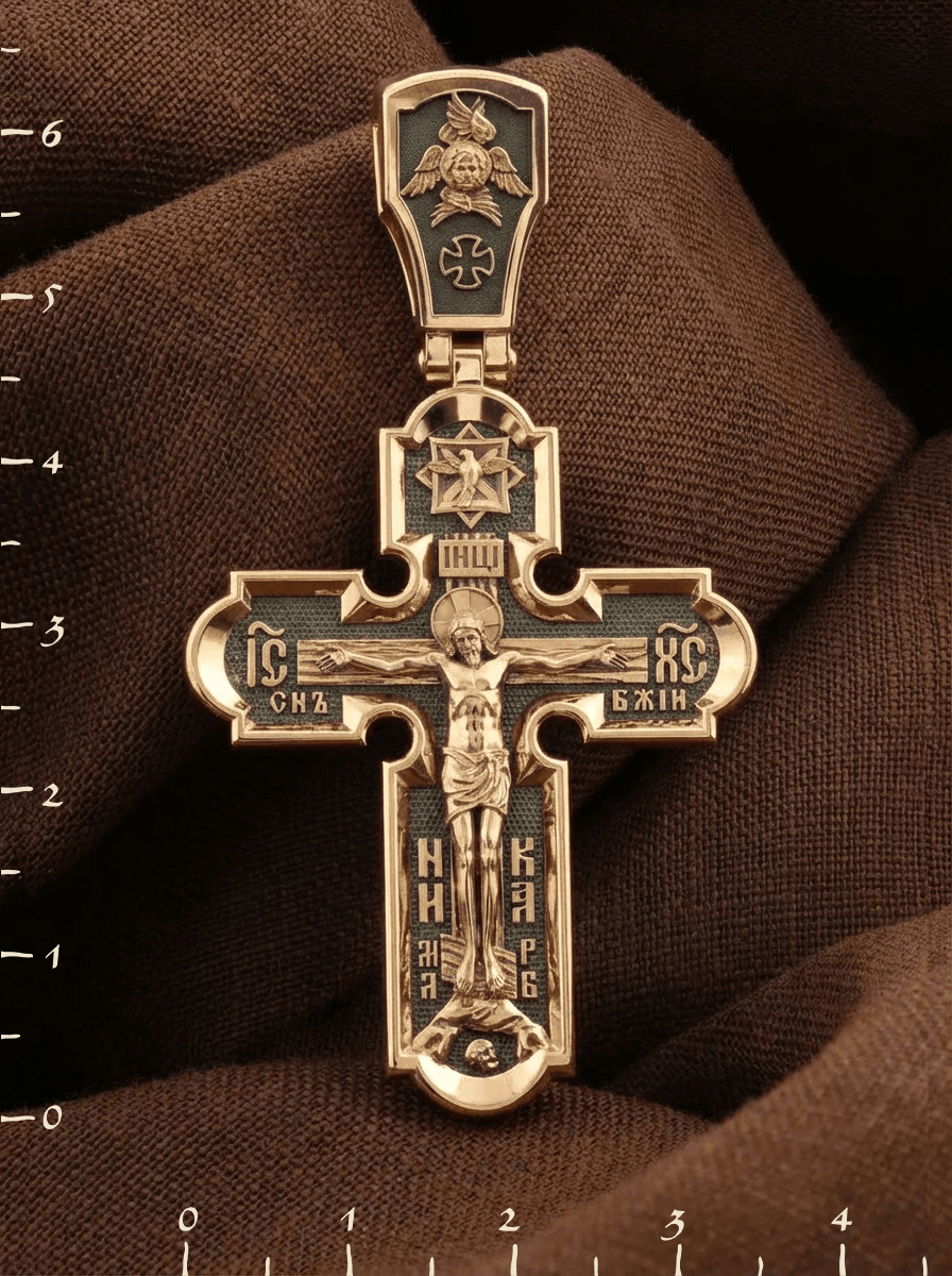 На лицевой стороне креста изображено Распятие Иисуса Христа. Господь представлен свободно покоящимся на кресте с простертыми руками и как бы обнимающим всю Вселенную. Он — Спаситель, искупивший грехи мира, «поправший смертию смерть» и призывающий к Себе «все концы земли». Поэтому рядом с Его образом помещены слова — «НИКА» и «Царь Славы». Эти слова характеризуют Господа как Великого Архиерея, победителя смерти. Верхняя перекладина символизирует титло — табличку, на которой, согласно Евангелию, было начертано: Иисус Назорей Царь Иудейский (IНЦI). Также Распятие сопровождается надписями, олицетворяющими Христа. Это святое имя Христа «IC» (Иисус) «ХС» (Христос), и словосочетание «СЫН БОЖИЙ». Крест стоит на горе камней, символизирующих Голгофу, в основании которой различается череп. Это голова Адама. На кулонном кольце помещено изображение серафима.