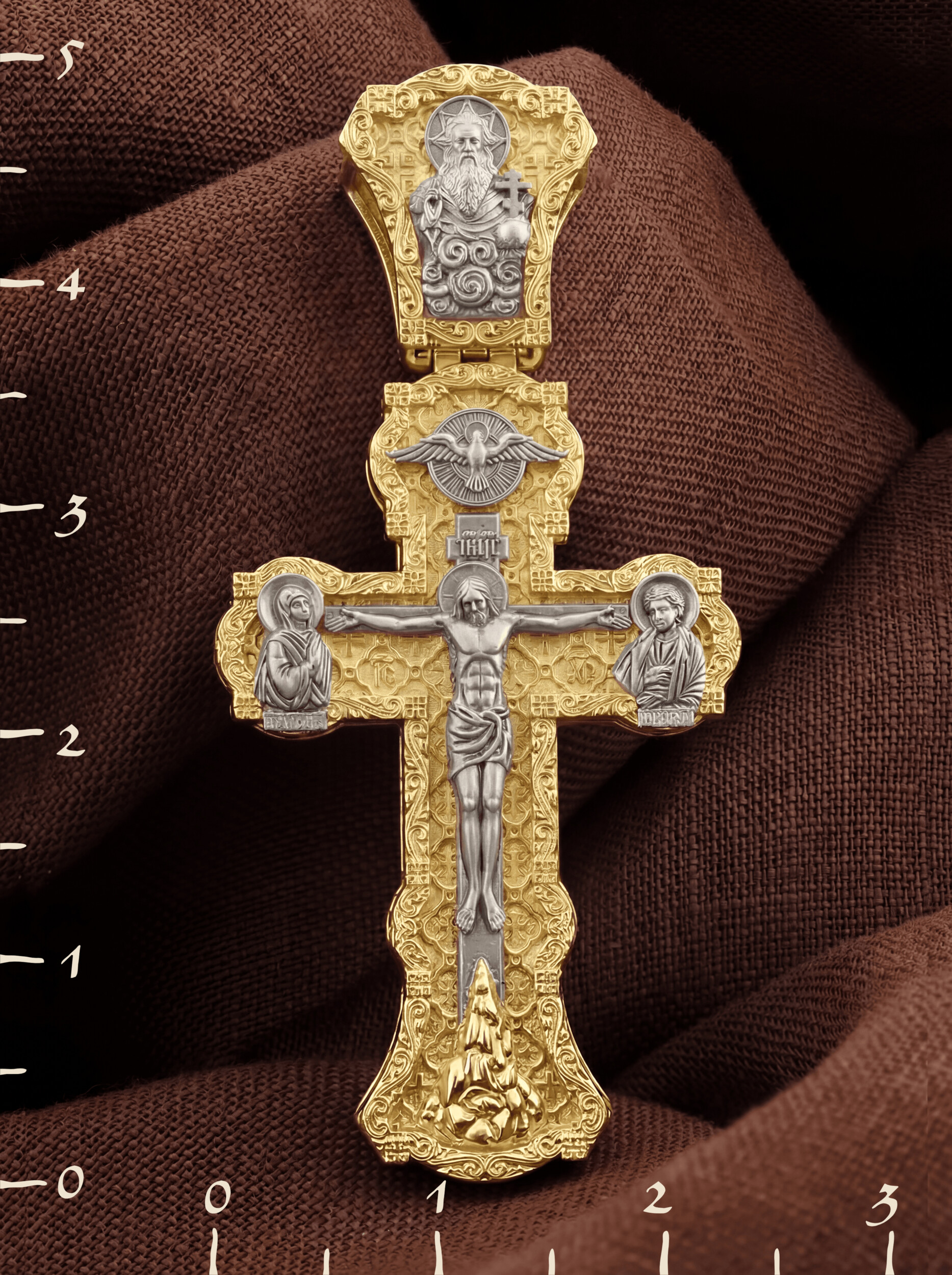 На лицевой стороне креста изображено Распятие Господа и Спасителя нашего Иисуса Христа. Христос, подвергнутый на кресте мучительной казни, своими страданиями искупил нас от древнего греха и даровал нам жизнь вечную. Без Распятия не было бы Воскресения Христова, и поэтому Крест из орудия казни обратился в святыню, в которой действует Благодать Божия. На верхней табличке, выше головы Иисуса, расположена надпись, составленная Понтием Пилатом на трех языках — «IНЦI». Она означает «Иисус Назорей, Царь Иудейский». Надпись «IС ХС» означает Иисус Христос и помещается на разных сторонах поперечной (большой) перекладины креста. Крест стоит на горе камней, символизирующих Голгофу. В ее основании различается череп– это голова Адама. У Креста стоят оплакивающие Господа Божия Матерь и апостол Иоанн Богослов. Из всех апостолов об одном лишь Иоанне Богослове говорится, что он стоял на Голгофе у креста Спасителя, не заботясь о собственной безопасности. Он услышал обращенные к Ней с высоты Креста слова Распятого Господа: «Жено, се сын Твой» и к нему: «Се Мати твоя». С этого времени Иоанн взял Матерь Божию к себе, и Она жила в его доме до самой смерти. Над Распятием — изображение Духа Святого в виде голубя, сходящего с Небес. На кулонном кольце изображен Бог Отец.