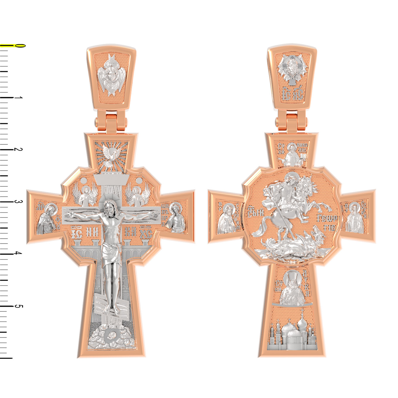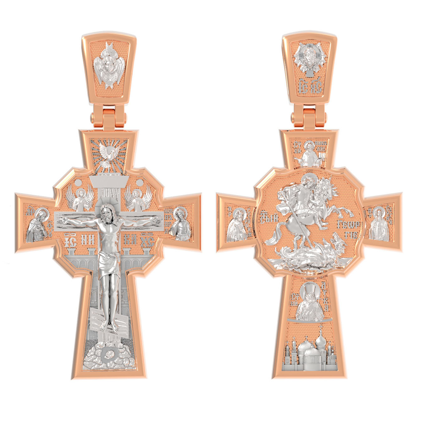 В центре оборотной стороне креста помещен образ Святого Великомученика Георгия Победоносца — одного из самых почитаемых и удивительных святых. На образке он изображен как воитель поражающий копьем огнедышащего змея. Змей символизирует собою сатанинские силы. Справа помещен образ Святого Преподобного Сергия, игумена Радонежского, чудотворца, слева — Преподобного Серафима Саровского, чудотвореца. Выше помещен образ Святителя Николая архиепископа Мир Ликийских, чудотвореца, ниже — образ святителя Луки (Войно-Ясенецкого), архиепископа Симферопольского и Крымского, исповедника и изображение Храма. На кулонном кольце изображен Спас Нерукотворный — образ Господа и Спасителя нашего Иисуса Христа, чудесно отпечатавшийся на плате, котором Христос вытер свой лик.
