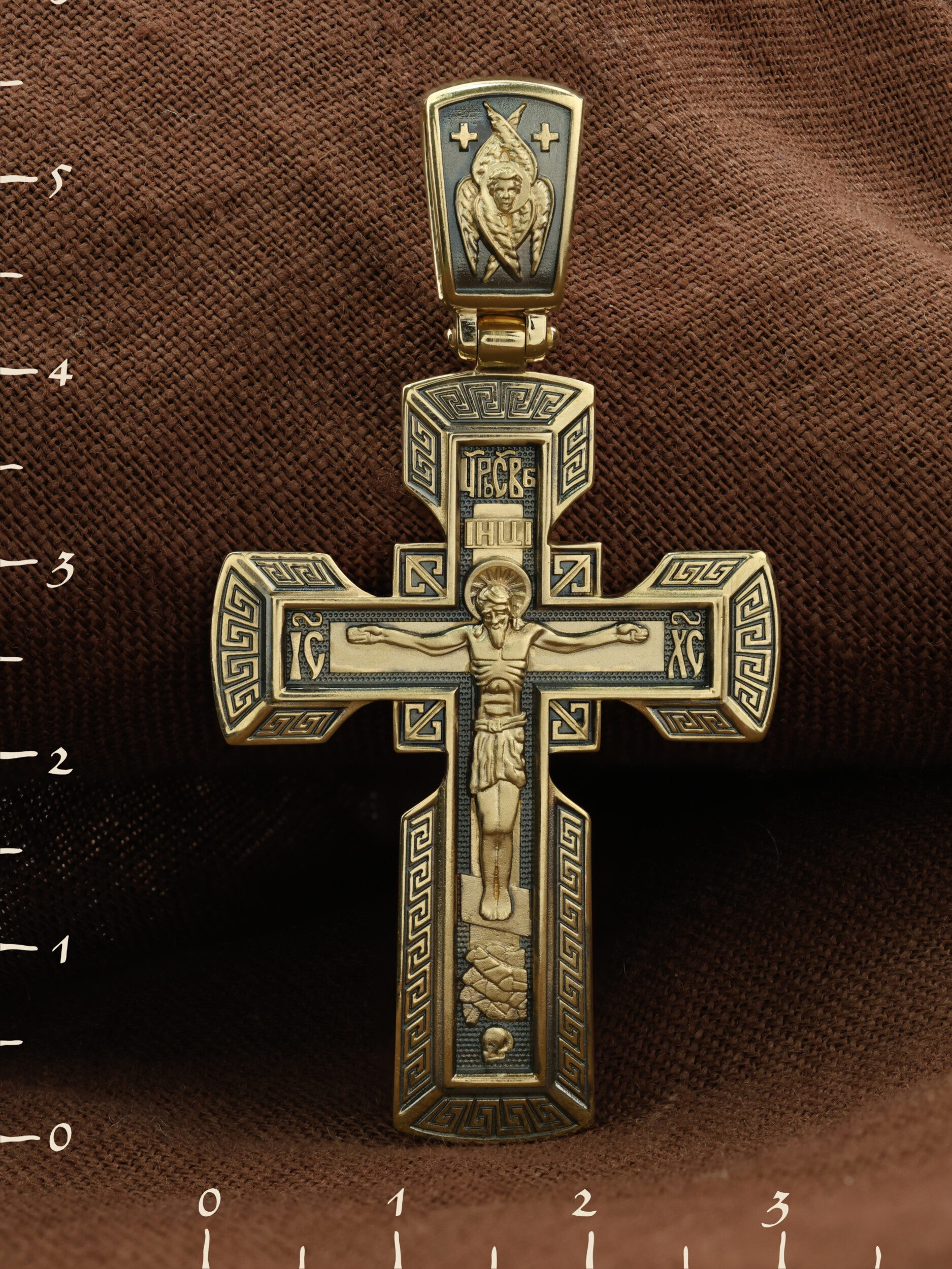 На его лицевой стороне изображено Распятие Господне на восьмиконечном Голгофском кресте. Над головой Спасителя на поперечной перекладине помещена надпись «IНЦI», которая является сокращенным выражением титла, установленного на Кресте Понтием Пилатом: «Иисус Назорей Царь Иудейский». На боковых оконечностях креста вписаны инициалы святого имени Христа «IС ХС». В верхней оконечности креста имеется монограмма «Царь Славы», которая гласит о том, что Христос — Великий Архиерей, Царь и Жертвенный Агнец, искупивший грехи мира. У подножия креста в виде каменистого пригорка изображена гора Голгофа с Главой Адамовой в пещере.