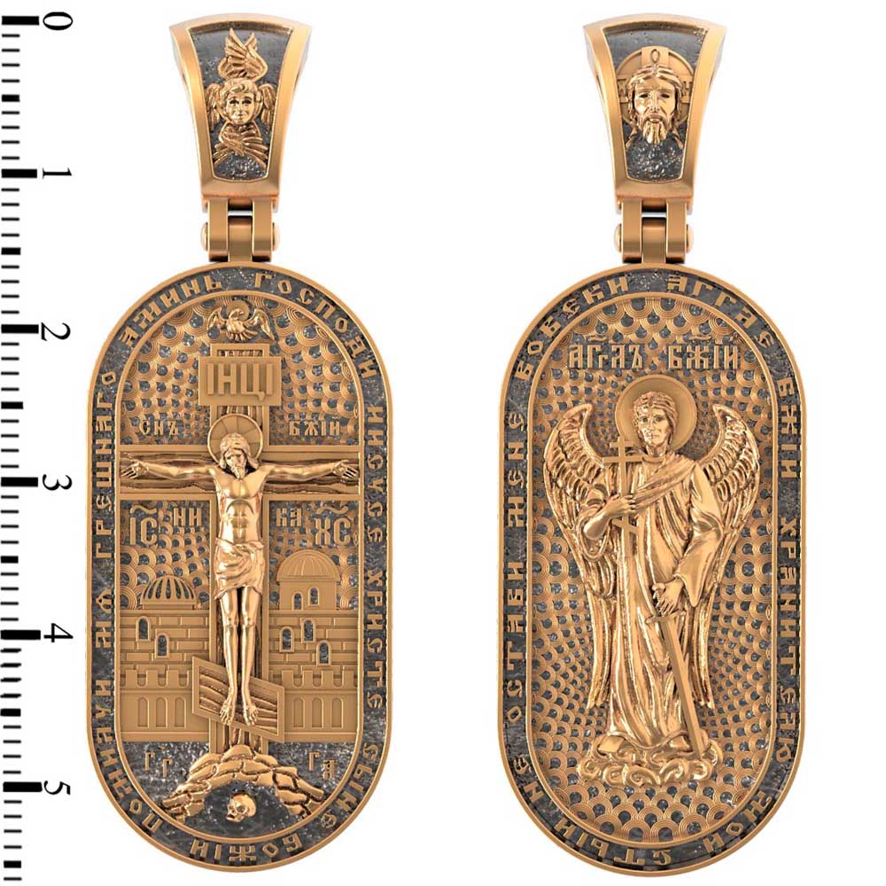 Центральную часть лицевой стороны занимает Распятие Христа — образ жертвы, принесенной Господом за грехи людей. Именно ко Христу, сошедшему на землю ради нашего спасения, возносятся все молитвы. Рядом с Его образом помещены слова — «НИКА» (греч. — Победитель) и «СЫН БОЖИЙ». Эти слова характеризуют Господа как Великого Архиерея, победителя смерти. Также Распятие сопровождается надписями, олицетворяющими Христа — это святое имя Христа «IC» (Иисус) «ХС» (Христос). Верхняя перекладина символизирует собой табличку с надписью «IHЦI» — Иисус Назарянин Царь Иудейский. Возвышение, на котором стоит Крест, символизирует гору Голгофу, на которой произошло Распятие. У подножия Креста изображают прах Адама, обозначенный черепом. На кулонном кольце изображен шестикрылый Серафим — самый приближенный к Господу Ангел. По контуру образка написана молитва: «Господи Иисусе Христе, Сыне Божий, помилуй мя грешного. Аминь»