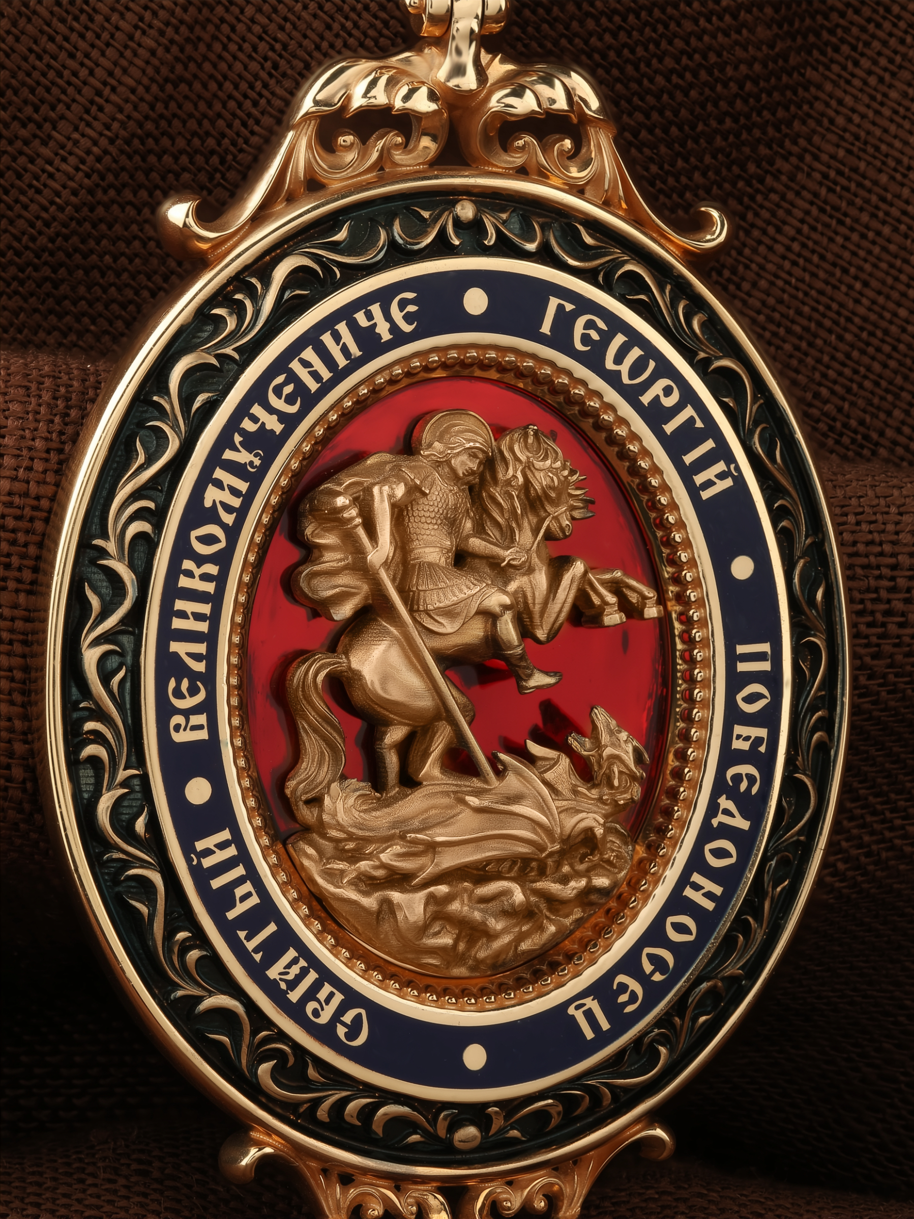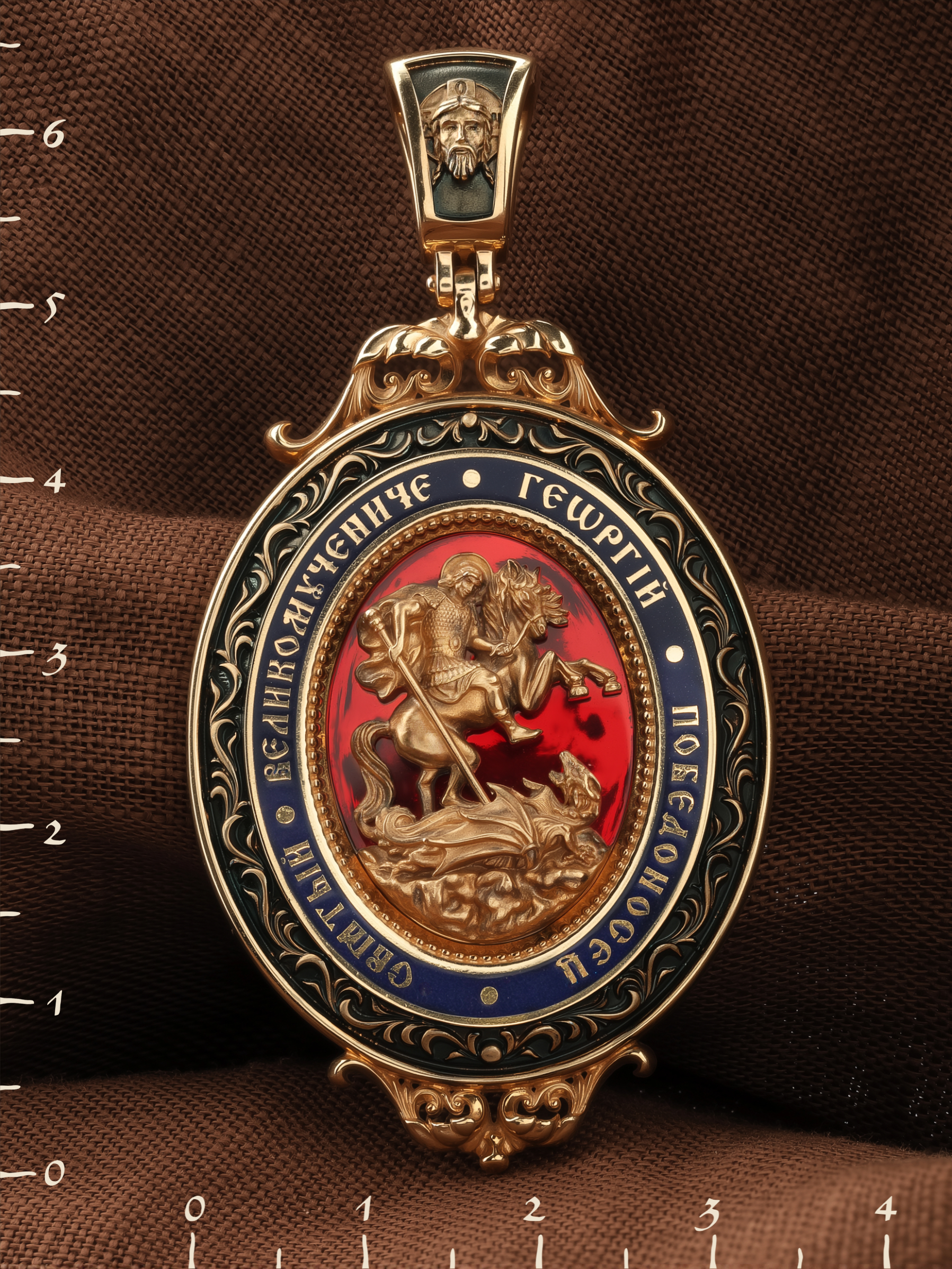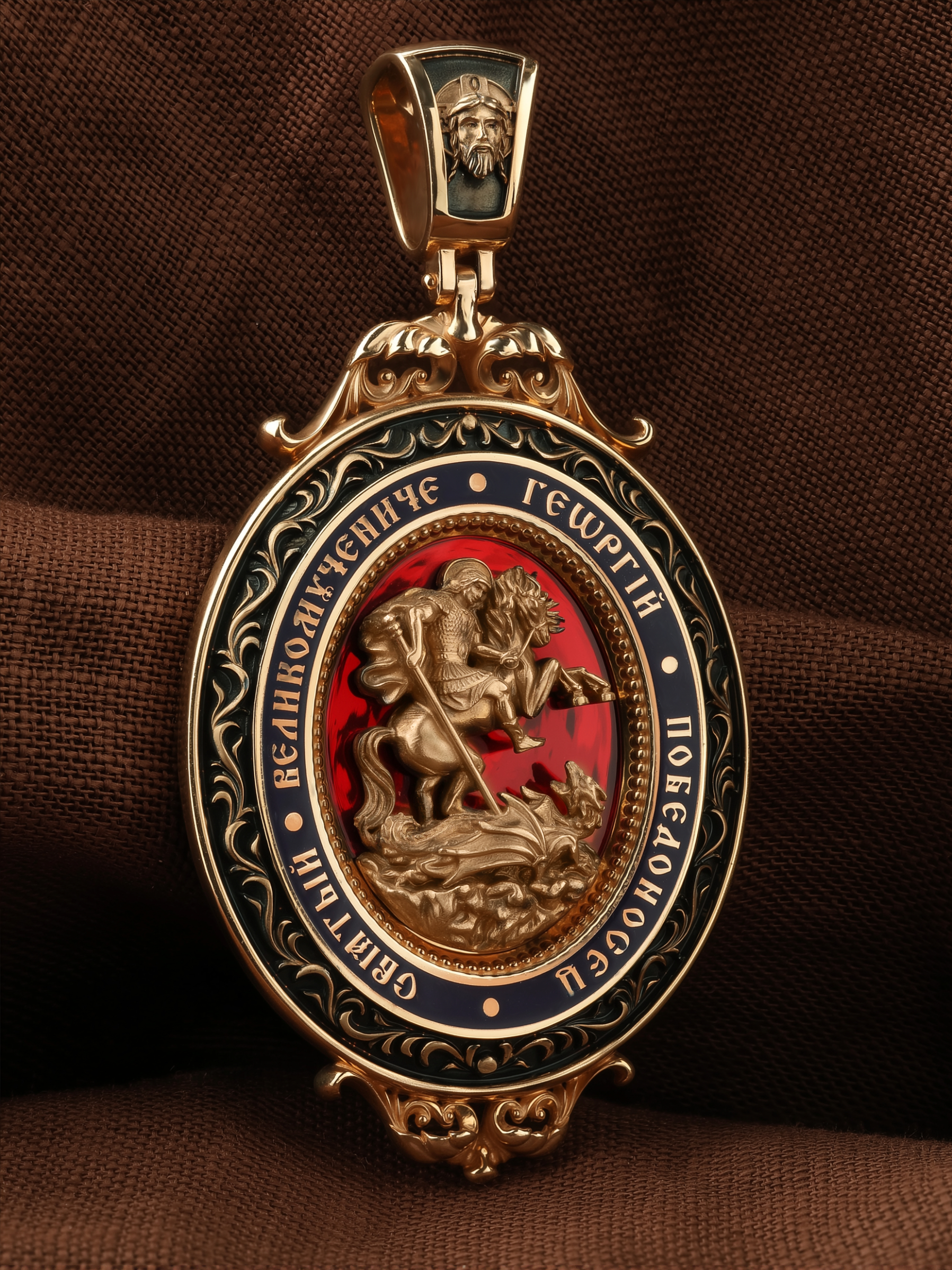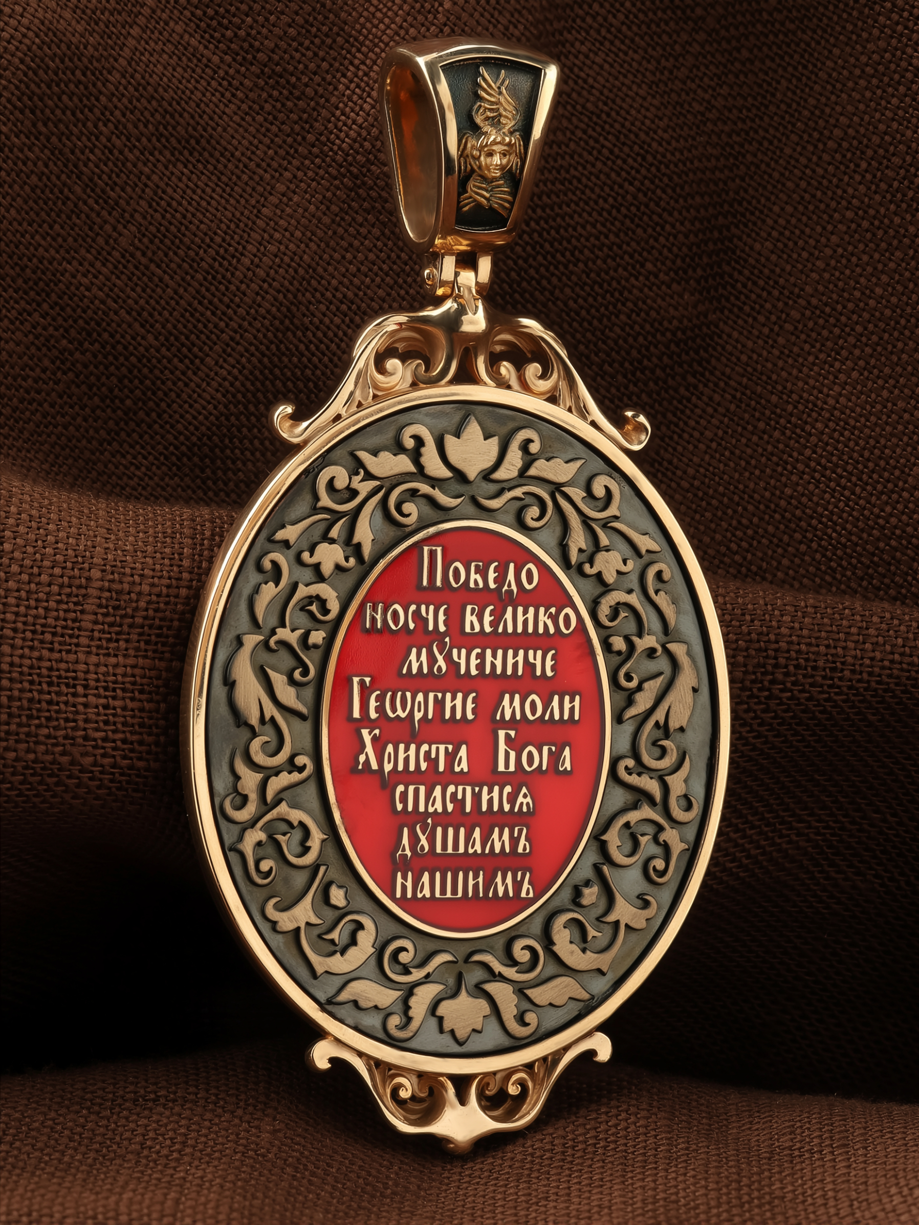Молитва перед иконой Георгия Победоносца поможет защититься от врагов, одержать победу в сражении (военном, спортивном, духовной брани с дьяволом), содействие в установлении мира между членами семьи, избавиться от телесного недуга. На кулонном кольце изображен Спас Нерукотворный — Символ вочеловечившегося Божества и шестикрылый Серафим — самый приближенный к Господу Ангел.