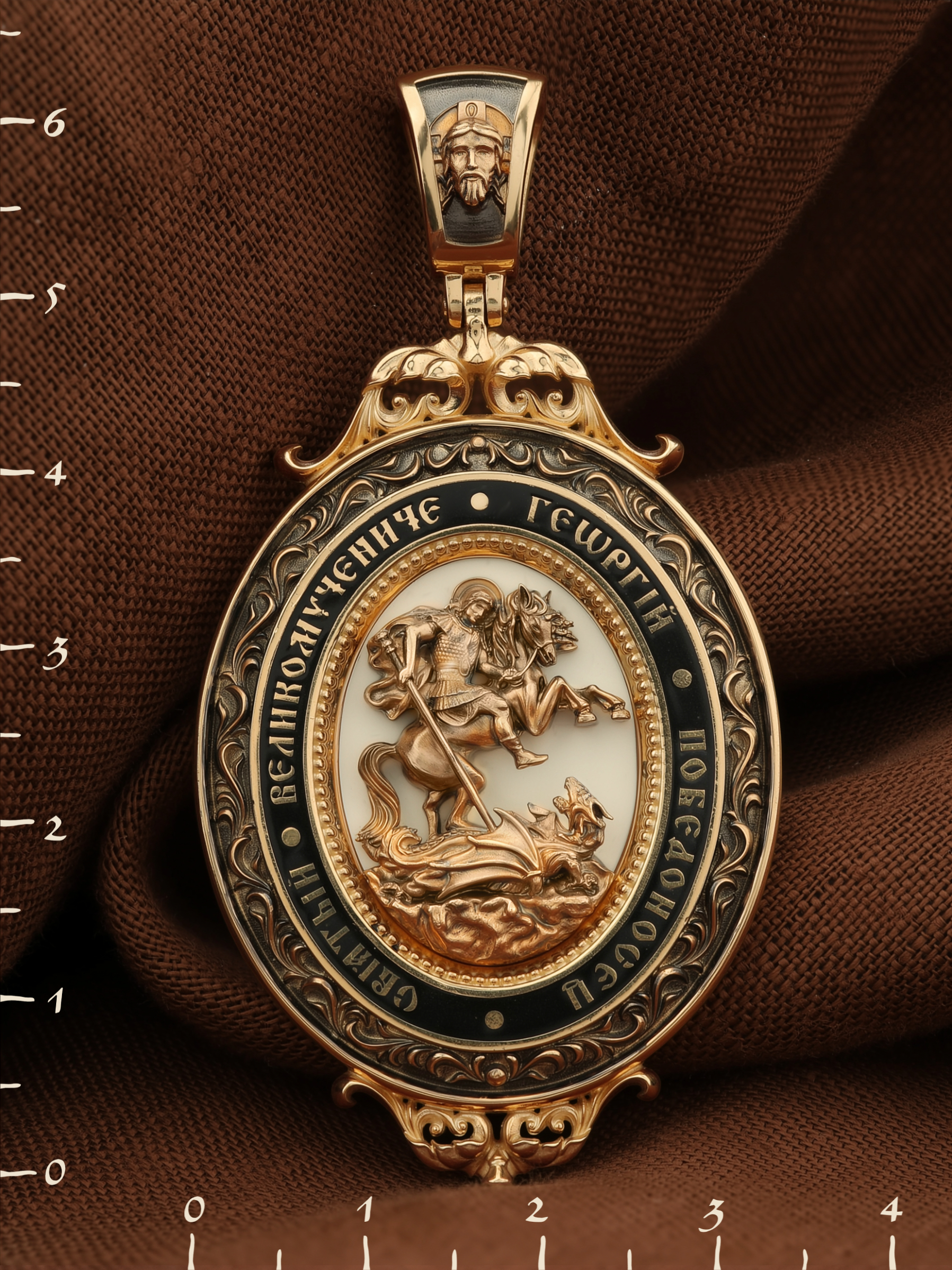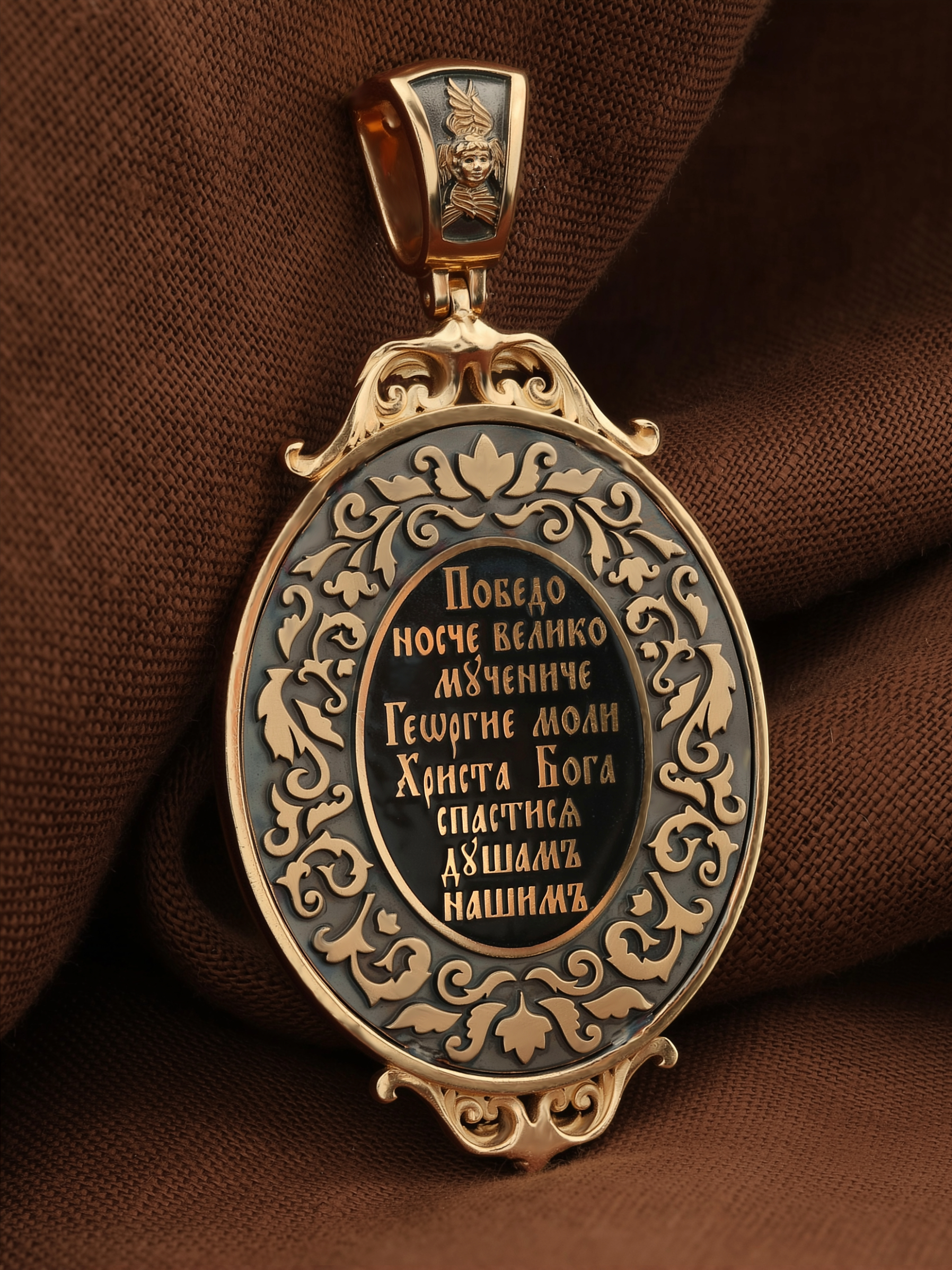 Молитва перед иконой Георгия Победоносца поможет защититься от врагов, одержать победу в сражении (военном, спортивном, духовной брани с дьяволом), содействие в установлении мира между членами семьи, избавиться от телесного недуга. На кулонном кольце изображен Спас Нерукотворный — Символ вочеловечившегося Божества и шестикрылый Серафим — самый приближенный к Господу Ангел.