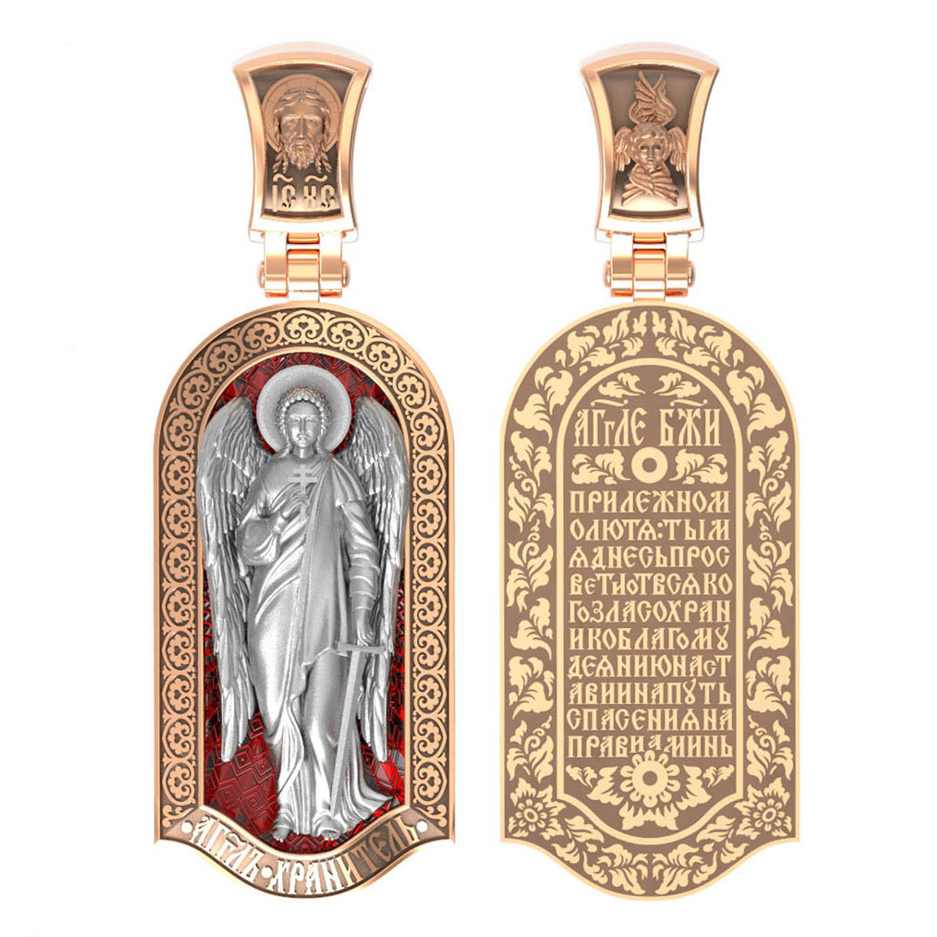 Основой композиции лицевой стороны является Ангела Хранителя. Образок Ангел Хранитель — это не просто украшение, а настоящая миниатюрная икона. В руках Ангел держит традиционные символические атрибуты Ангелов Хранителей: крест — знак послушания Христу и следования Его заповедям, меч — символ непримиримой борьбы, которую он ведет с бесами, отражая их нападения на людей. Слово «ангел» означает «вестник». Ангелы — верные служители Божьи, которых Господь посылает возвещать Свои повеления. Ангелы тварны, как и люди, но имеют другую природу. На иконах они изображаются в человеческом обличье с большими крыльями. Могучие крылья ангелов символизируют быстроту, с которой они исполняют повеления Бога, а небольшие ленточки у ушей –тороки, или слухи — показывают, что они всегда слышат Его голос.