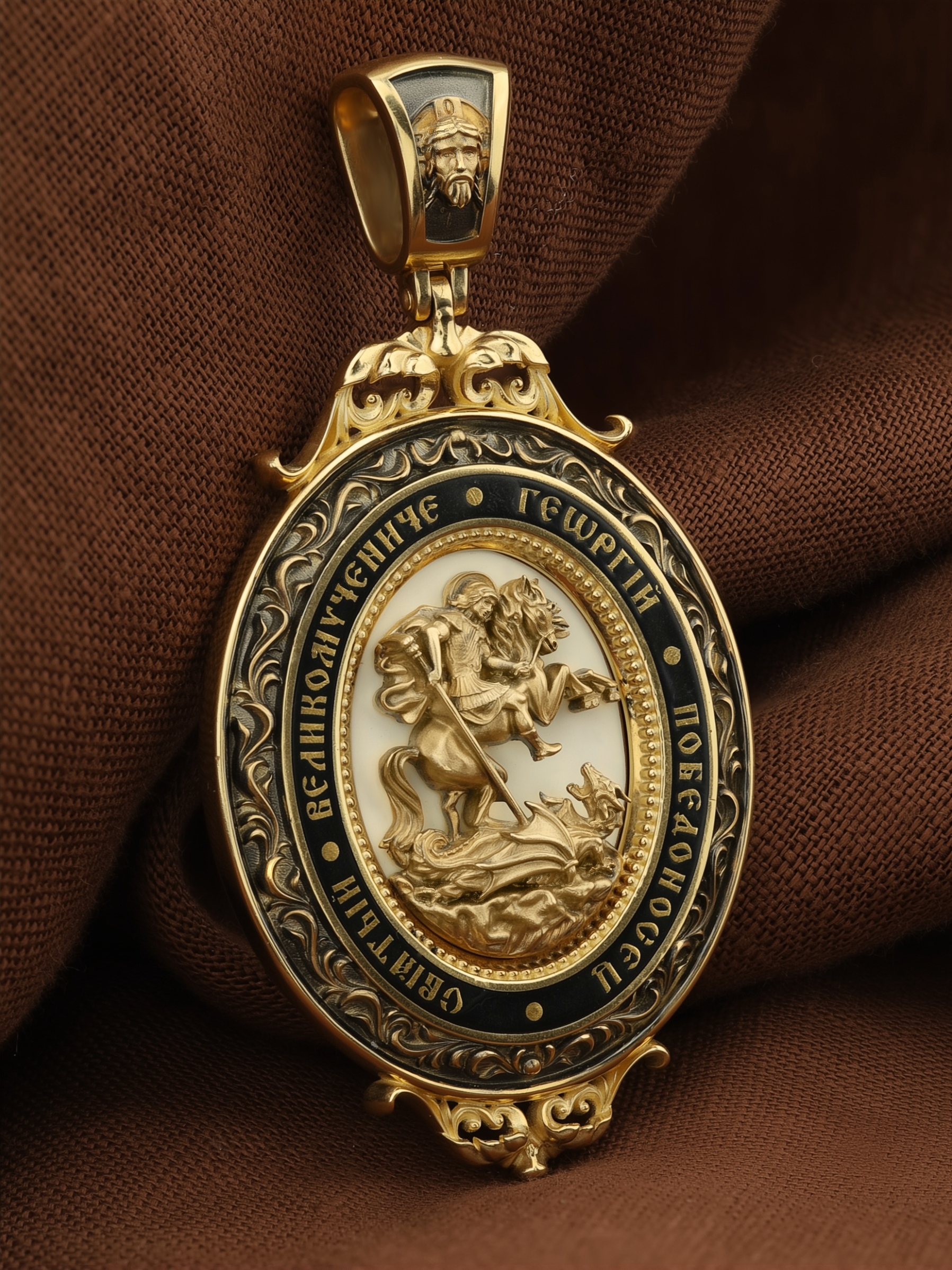 Молитва перед иконой Георгия Победоносца поможет защититься от врагов, одержать победу в сражении (военном, спортивном, духовной брани с дьяволом), содействие в установлении мира между членами семьи, избавиться от телесного недуга. На кулонном кольце изображен Спас Нерукотворный — Символ вочеловечившегося Божества и шестикрылый Серафим — самый приближенный к Господу Ангел.