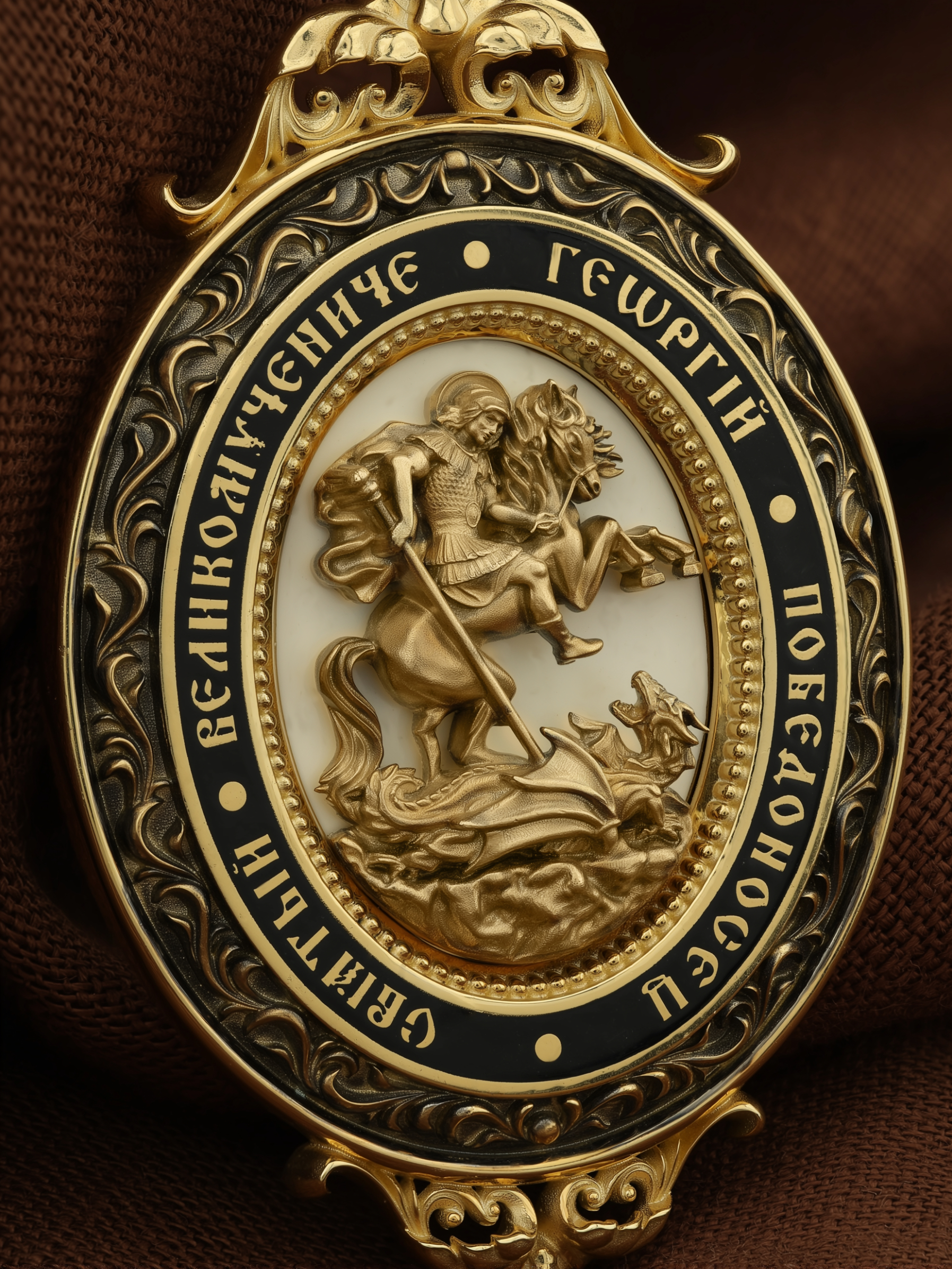 Основой композиции лицевой стороны является изображение Святого Георгия Победоносца. Образ Великомученика считают одним из наиболее чтимых святынь в Святыни Православных, он олицетворяет собой заступника для верующих, чья жизнь имеет какое-либо отношение к военным делам, также он может оберегать и землевладельцев. Одно из самых великих чудес которое сотворил Великомученик так это — спасения всего города от устрашающего змия. Молитвами и своей непреклонной верой, взываемой к Всевышнему, он смог одолеть чудовище. Святой убил змея, спас жителей и их души от влияния дьявола, породив в них надежду и веру в Господа, призывая людей принять христианскую веру.