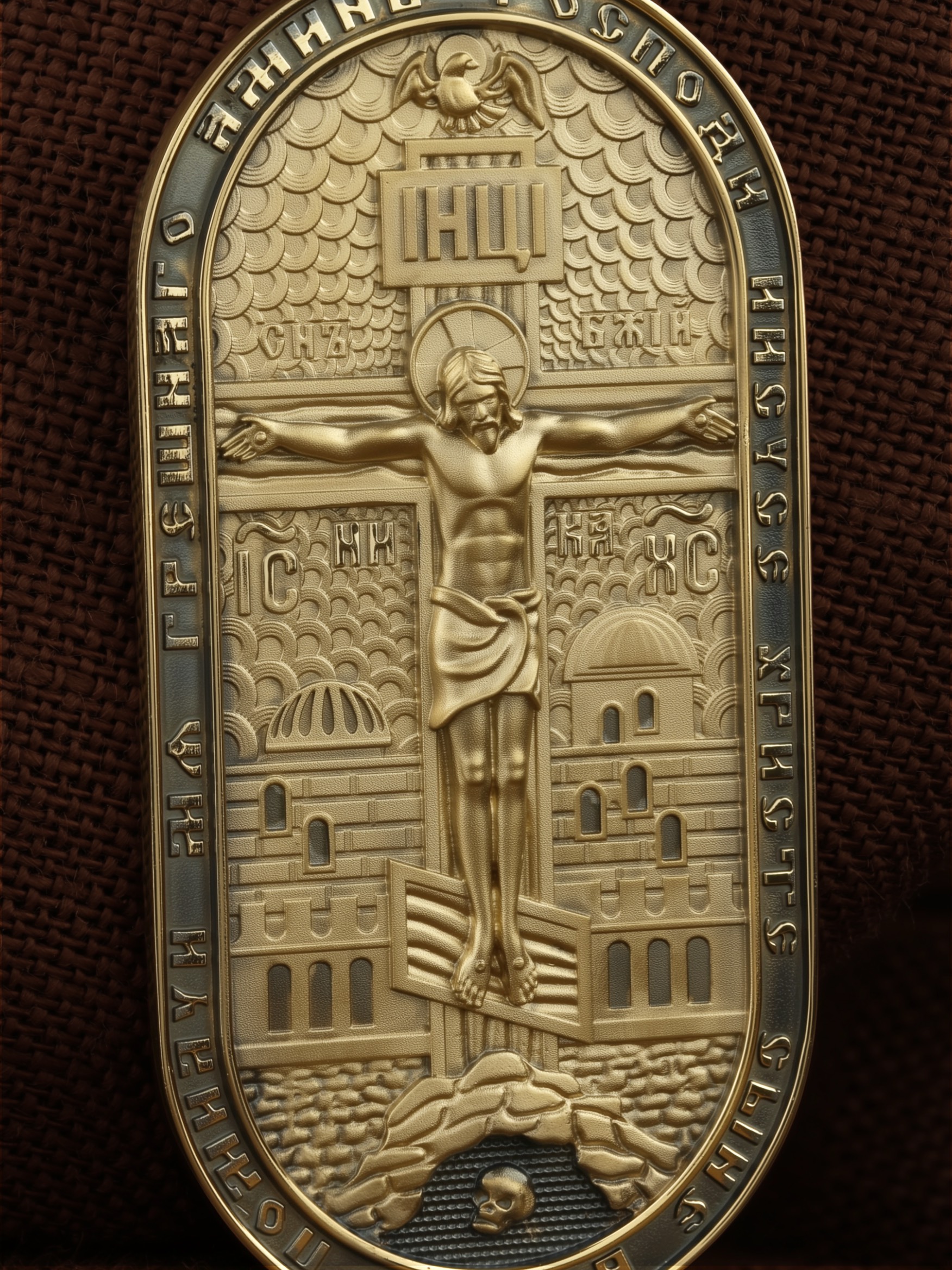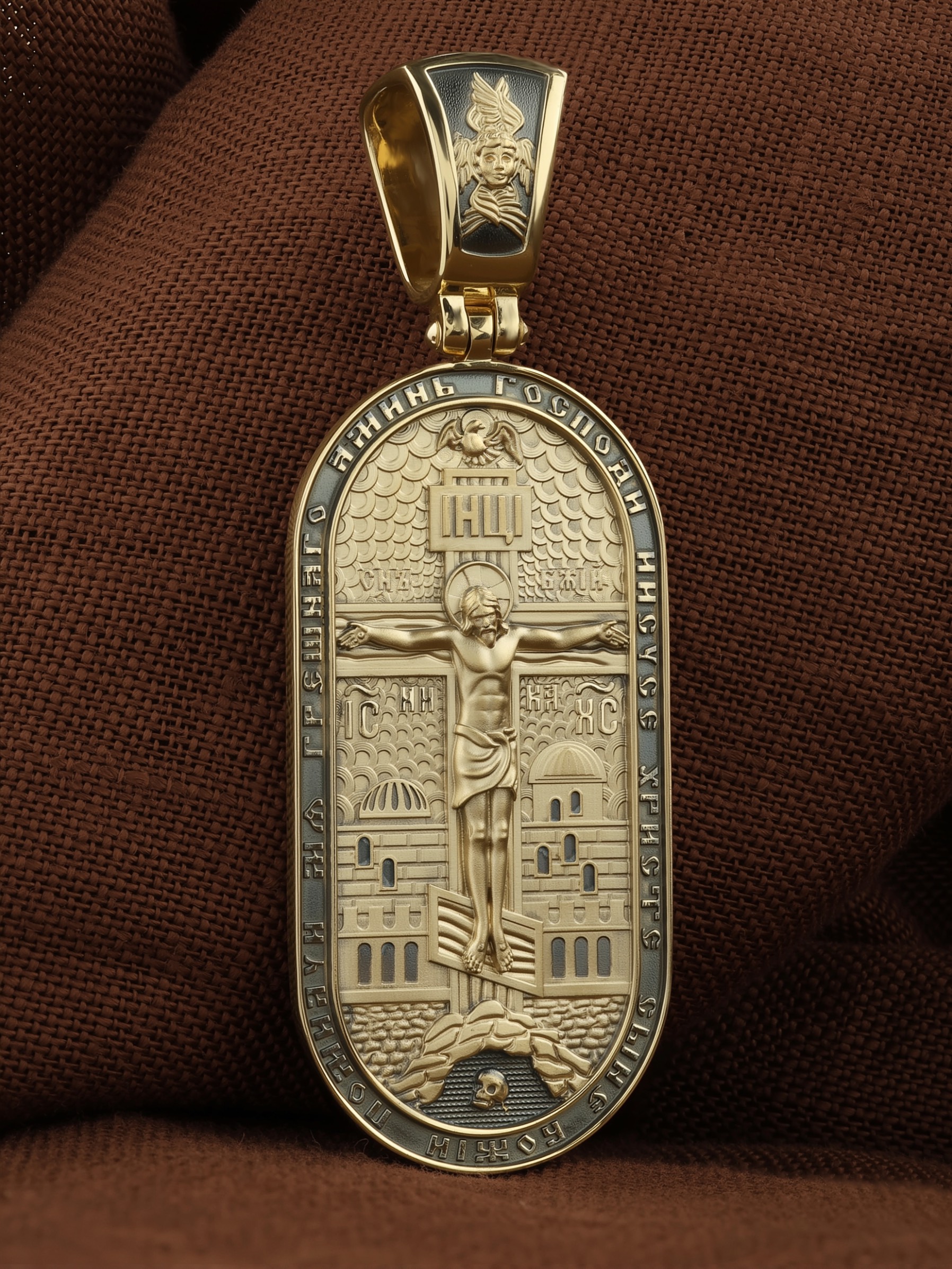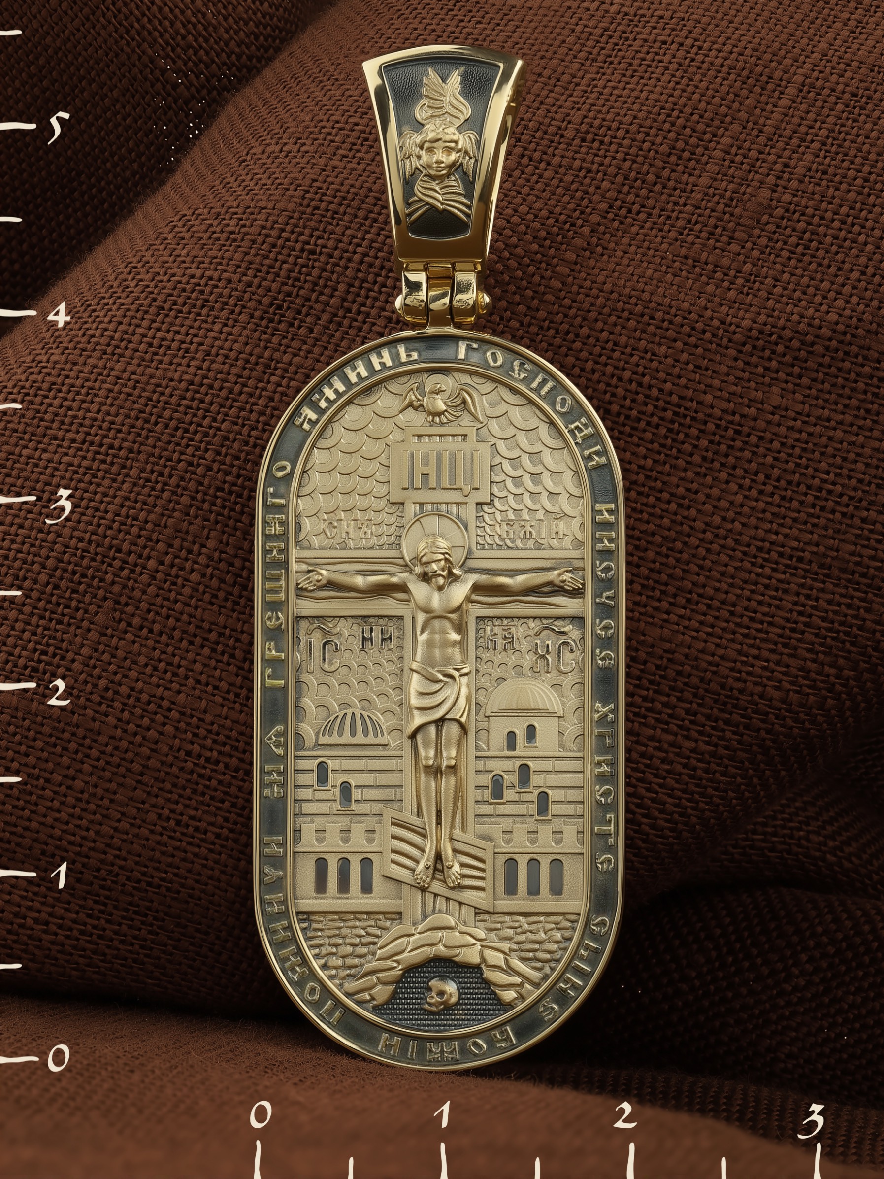 Центральную часть лицевой стороны занимает Распятие, потому что это орудие казни Иисус Христос сделал орудием победы над грехом и смертью. Своими страданиями Он искупил грехи человечества, умерев и сошествовав во ад, победил сатану, освободил души праведников от вечной смерти и открыл им небесные врата рая. Жертва Христа сделала возможным спасение для каждого человека. На православном кресте Христос не умирает, а свободно простирает руки, ладони Иисуса открыты, будто он хочет обнять все человечество, даря им свою любовь и открывая путь к вечной жизни.