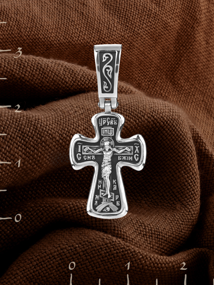 На лицевой стороне креста изображено Распятие, потому что это орудие казни Иисус Христос сделал орудием победы над грехом и смертью. Своими страданиями Он искупил грехи человечества, умерев и сошествовав во ад, победил сатану, освободил души праведников от вечной смерти и открыл им небесные врата рая. Жертва Христа сделала возможным спасение для каждого человека. На православном кресте Христос не умирает, а свободно простирает руки, ладони Иисуса открыты, будто он хочет обнять все человечество, даря им свою любовь и открывая путь к вечной жизни. Над титлом видим слова «ЦРЬ СЛВЫ» — Царь Славы. Верхняя перекладина символизирует собой табличку с надписью «IHЦI» — Иисус Назарянин Царь Иудейский. Возле перекладины пишется сокращенно имя Спасителя «IC XC» — Иисус Христос, ниже перекладины добавляется: словосочетание «СНЪ БЖІЙ» — Сын Божий и «НИКА» (греч. — Победитель). Возвышение, на котором стоит Крест, символизирует гору Голгофу, на которой произошло Распятие. У подножия Креста изображают прах Адама, обозначенный черепом.