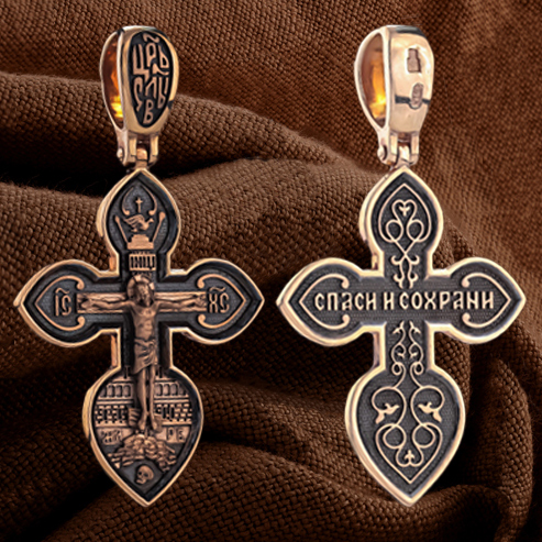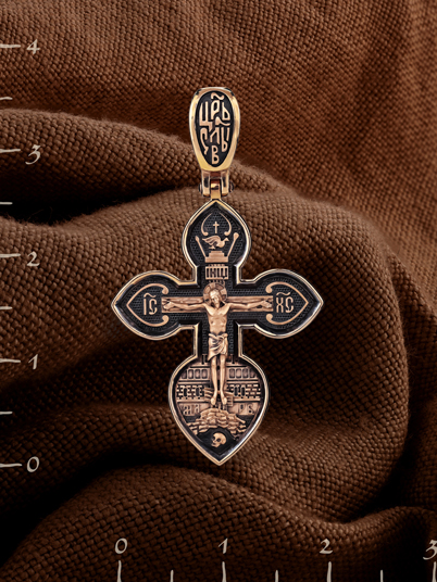 На лицевой стороне нательного креста изображено Распятие Господа нашего Иисуса Христа. Крест Господень стоит на небольшом каменистом возвышении, символизирующем гору Голгофу, которая обозначена буквами МЛРБ (Место Лобное Рай Бысть). Над головой Господа на поперечной перекладине написано «ИНЦИ», что символизирует табличку, которая была прибита к Кресту, с надписью «Иисус Назорей Царь Иудейский».По сторонам основной перекладины расположены позолоченные рельефные инициалы Христа «ИС ХС».