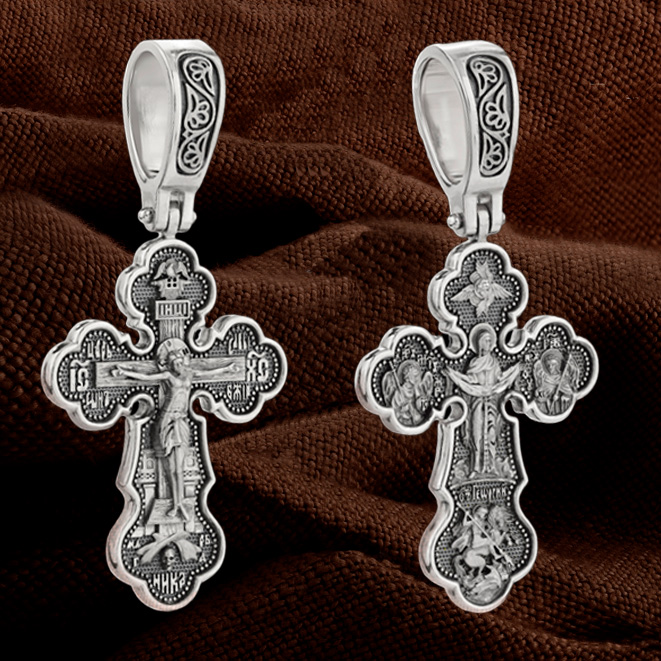 Центральную часть оборотной стороны креста украшает икона Божией Матери «Покров Пресвятой Богородицы». Праздник Покрова Пресвятой Богородицы пришел на Русь в XII веке из Византии и стал одним из самых почитаемых. Пресвятая Богородица простирает Свой молитвенный покров над всеми православными христианами и умоляет Сына своего о даровании вечного спасения каждому человеку. Над образом помещен шестикрылый Серафим. Справа помещено изображение Архангела Гавриила, слева- Архангела Михаила. На кресте внизу помещено изображение Святого Великомученика Георгия Победоносца — одного из самых почитаемых и удивительных святых. Он изображен как воитель, сидящий на вздыбленном коне и поражающий копьем огнедышащего змея. Змей символизирует собою сатанинские силы.
