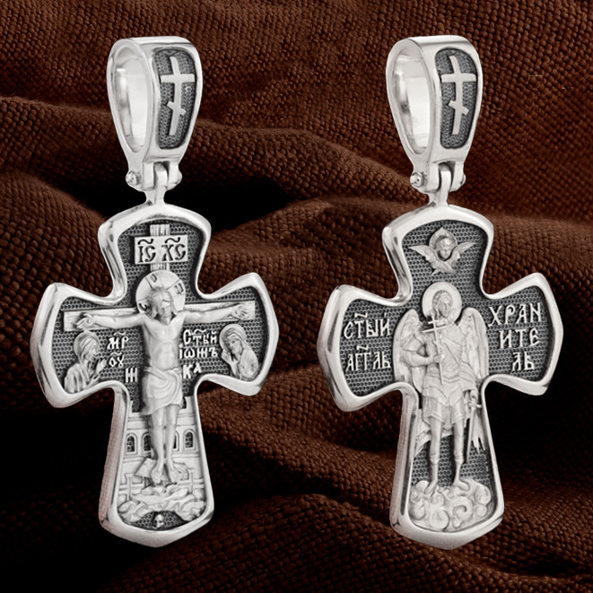 На оборотной стороне креста изображен Святой Ангел-Хранитель держащего в правой руке крест, а в левой — мечь. Ангел-Хранитель — это Ангел приставляемый Богом к человеку при крещении для охраны и помощи в добрых делах. Он невидимо находится при человеке на протяжении всей его жизни, если человек сохраняет в себе любовь к Богу и истинную веру перед Ним. Ангел-Xранитель делают для нас все, что служит к истинному нашему благу и спасению. Невидимо пребывая при нас постоянно, он, руководствуя нас ко спасению, не только по нашему желанию таинственно наставляет нас на все доброе и полезное, не только возносит наши молитвы к Богу, но еще и сам от себя охраняют и защищают нас от врагов видимых и невидимых и ходатайствует за нас пред Богом. Одного лишь каждому из нас он желает — спасения души; к этому он направляет все свои заботы. Над образом помещен Серафим.