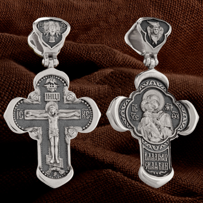 В центре оборотной стороне креста помещен образ Владимирской иконы Божией Матери — один из самых чтимых святынь Русской православной церкви. По преданию, икона была написана Святым апостолом и евангелистом Лукой во время земной жизни Богородицы. Икона Владимирской Божией Матери вплоть до V века находилась в Иерусалиме, затем была перевезена в Византию. На Русь икона была привезена в 1131 г. За прошедшие столетия святыня неоднократно переезжала из Владимира в Москву и обратно, не раз спасая страну от захватчиков. Русская Православная Церковь установила троекратное празднование Владимирской иконе Божией Матери. Каждый из дней празднования связан с избавлением русского народа от порабощения иноплеменниками по молитвам ко Пресвятой Богородице