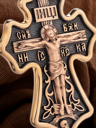 Основной композицией лицевой стороны является Распятие Господа Иисуса Христа. Позади Распятия видна иерусалимская стена, знак того, что Господь был распят вне стен города. Стена символизирует и Небесный Иерусалим, путь который открылся для человека через Голгофу. У подножья Господа в виде скалистой горки видна сама Голгофа с Главой Адамовой в пещере. Распятие сопровождается каноническими надписями. Это святое имя Христа, которое принято писать на иконах сокращенно — «ИС ХС», словосочетание «СЫН БОЖИЙ», что означает божественную природу Иисуса Христа, и надпись «НИКА» — «победитель». Над головой Господа на поперечной перекладине аббревиатура «IНЦI», что символизирует табличку, которая была прибита к Кресту, с надписью «Иисус Назорей Царь Иудейский».