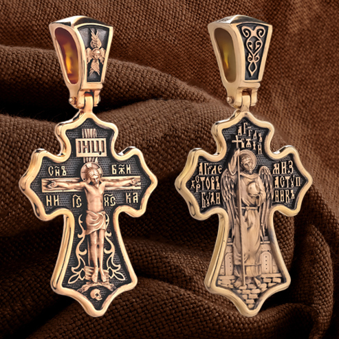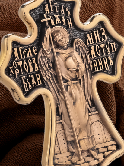 Оборотную сторону креста возглавляет Ангел Хранитель. Он защищает человека от злых духовных и физических нападений. Ангел не может нарушить свободу воли человека, поэтому его надо молитвенно просить о помощи. Вокруг его образа написана молитва: «Ангеле Христов, буди ми заступник».