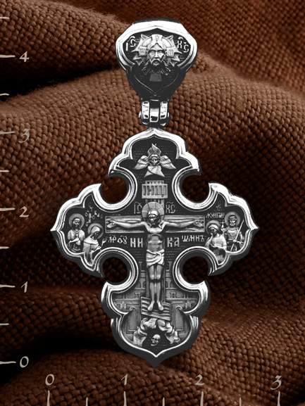 На лицевой стороне креста изображено Распятие Господа и Спасителя нашего Иисуса Христа. Своими крестными страданиями Господь смыл наши грехи, покрыл наш долг перед Богом или, на языке Писания, нас «искупил». В Голгофе сокрыта непостижимая тайна бесконечной правды и любви Бога. Крест стал символом победы добра над злом, жизни над смертью, напоминанием бесконечной Божьей любви, предметом радости. Воплотившийся Сын Божий Своею кровью освятил крест и сделал его проводником Своей благодати, источником освящения верующих. На верхней табличке, выше головы Иисуса, расположена надпись, составленная Понтием Пилатом — «IНЦI». Она означает «Иисус Назорей, Царь Иудейский». Ниже перекладины написано сокращенно имя Спасителя «IC» «XC» — Иисус Христос. Крест стоит на горе камней, символизирующих Голгофу. Под подножием Креста изображена покоящаяся голова (череп) Адама. Слева от Распятия стоят оплакивающие Господа Пресвятая Богородица и святая мироносица Мария Клеопова. Справа — апостол и евангелист Иоанн Богослов, один из ближайших учеников Иисуса Христа и сотник Лонгин с крестом в правой руке и копьем — в левой. По преданию, увидя, что они горько плачут, Иисус сказал Матери Своей: «Жено! Се сын Твой!» Потом сказал ученику Иоанну: «Се мати твоя». С этого времени Иоанн взял Матерь Божию к себе, и Она жила в его доме до самой смерти. На кулонном кольце изображен Спас Нерукотворный — образ Господа и Спасителя нашего Иисуса Христа, чудесно отпечатавшийся на плате, которым Христос вытер свой лик.