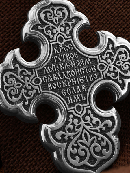 На оборотной стороне креста написана песнь: «Кресту Твоему поклоняемся, Владыко, и святое Воскресение Твое славим». На кулонном кольце изображен Ангел Серафим.