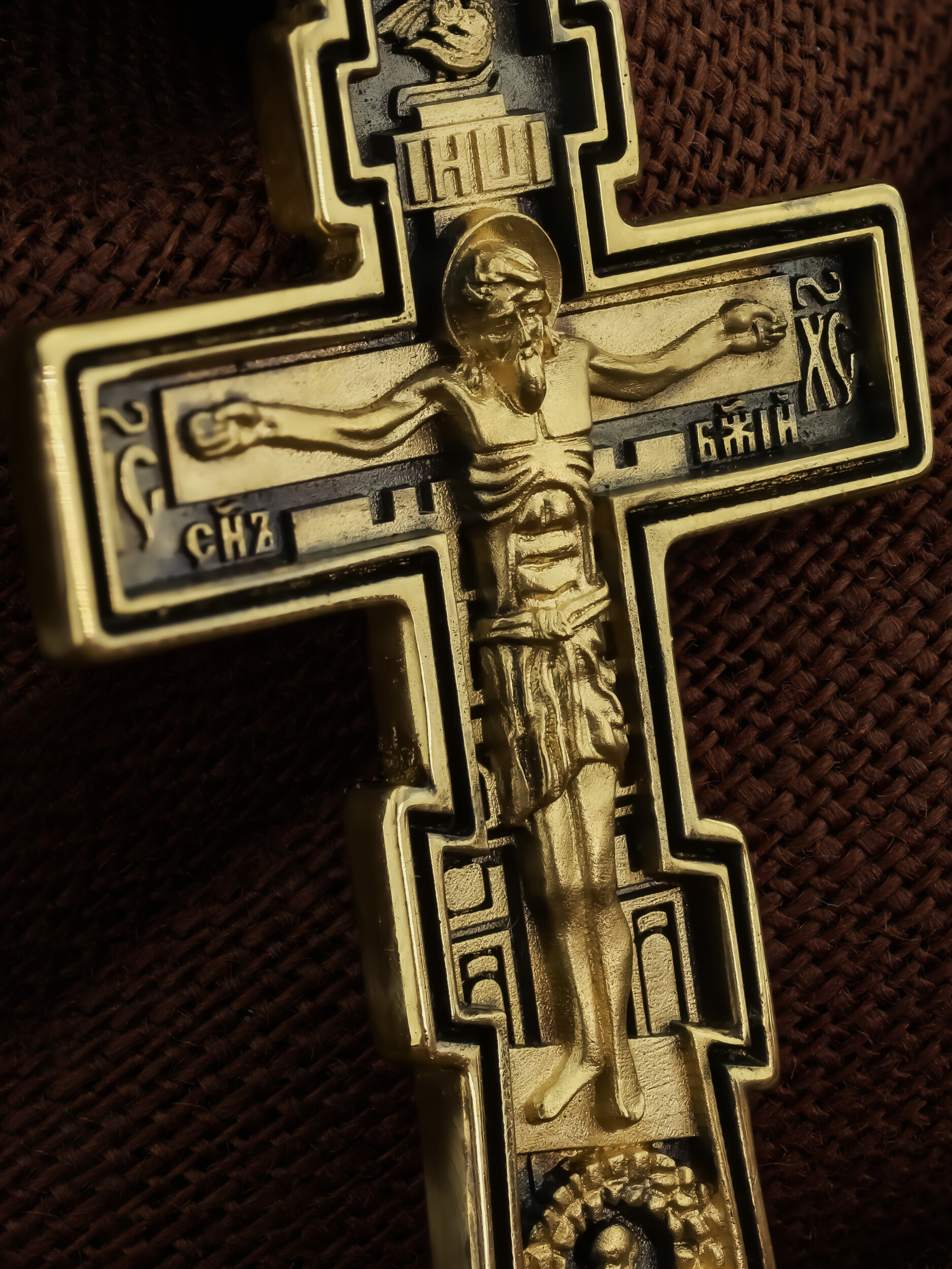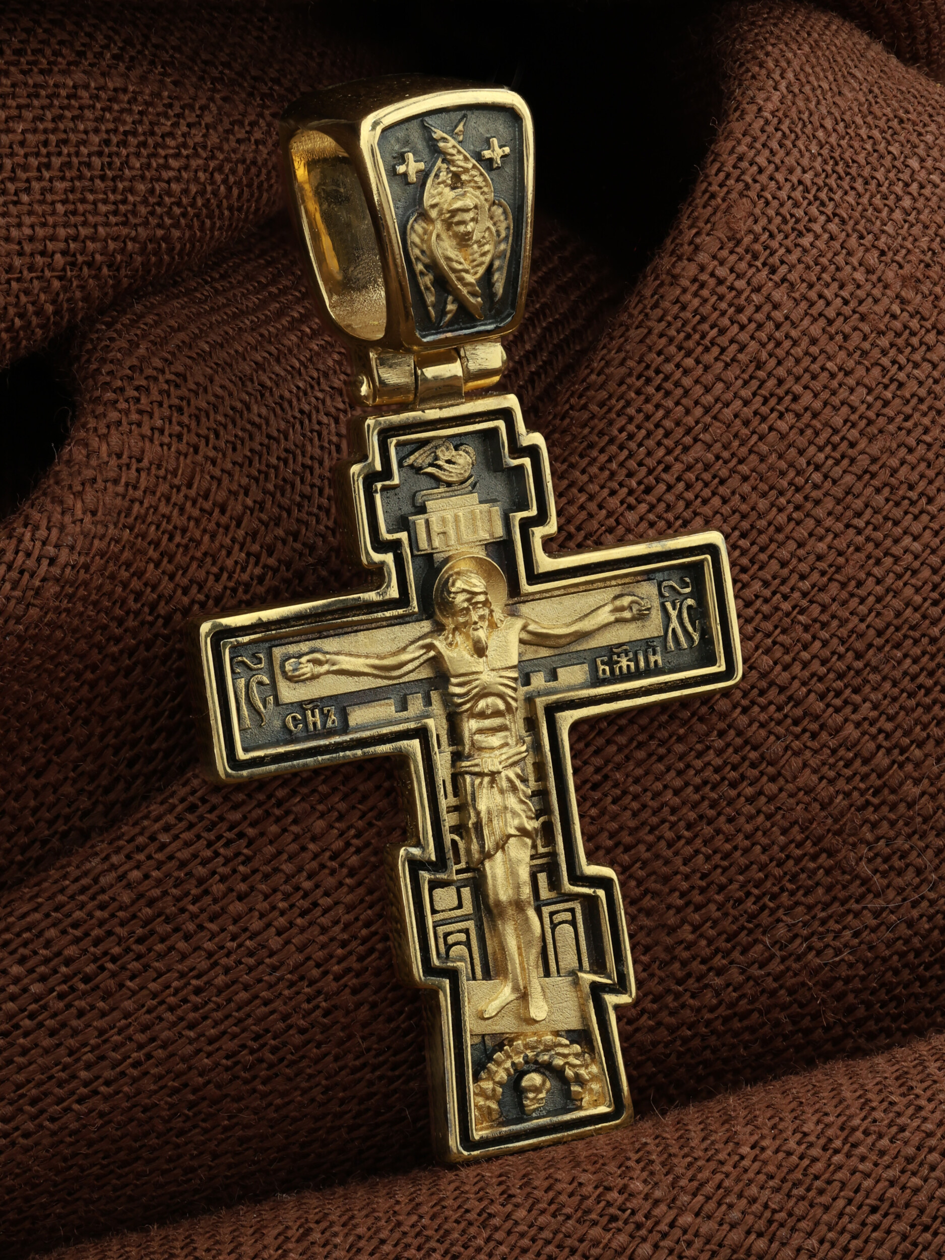 Восьмиконечный нательный крест с Распятием Иисуса Христа на горе Голгофе. Форма этого кресты является одной из самых распространенных на Руси и более всего соответствует тому Кресту, на котором был распят Христос.