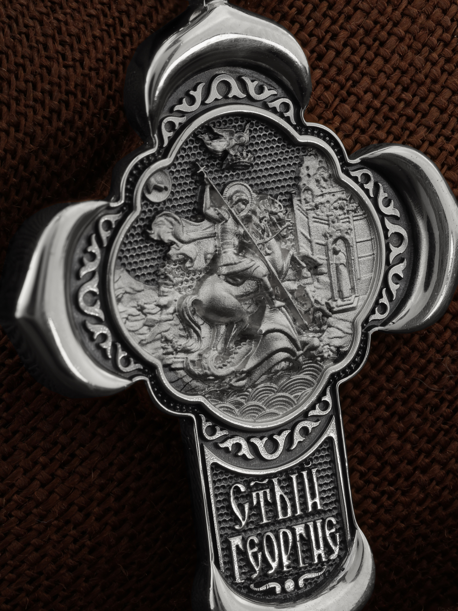 На оборотной стороне креста помещено изображение Святого Великомученика Георгия Победоносца — одного из самых почитаемых и удивительных святых. Георгий родился в Каппадокии (Малая Азия) в семье богатых и знатных горожан. Юношей поступил на службу к римскому императору Диоклетиану, за отличное знание военного дела и проявленную в боях и походах храбрость был приближен к императору и удостоен высокого воинского звания. Во время начавшихся гонений на христиан, перешел на сторону гонимых и, отвергнув человеческий страх, стал ярым проповедником учения Христа. Мучители подвергли опального воеводу жесточайшим восьмидневным пыткам и казнили его (обезглавили) в возрасте около тридцати лет в 303 году. Георгий изображен как воитель, сидящий на вздыбленном коне и поражающий копьем огнедышащего змея. Слева над образом изображена благословляющая Божия десница. Над святым изображен ангел возлагающий на него венец мученика. Змей символизирует собою сатанинские силы. Молитвами вознесенными к Всевышнему и своей непреклонной верой он смог одолеть чудовище. Святой убил змея, спас царскую дочь, принесенную в жертву, и жителей города, их души от влияния дьявола, породив в них надежду и веру в Господа, призывая людей принять христианскую веру. На кулонном кольце изображен шестикрылый Ангел — Серафим.