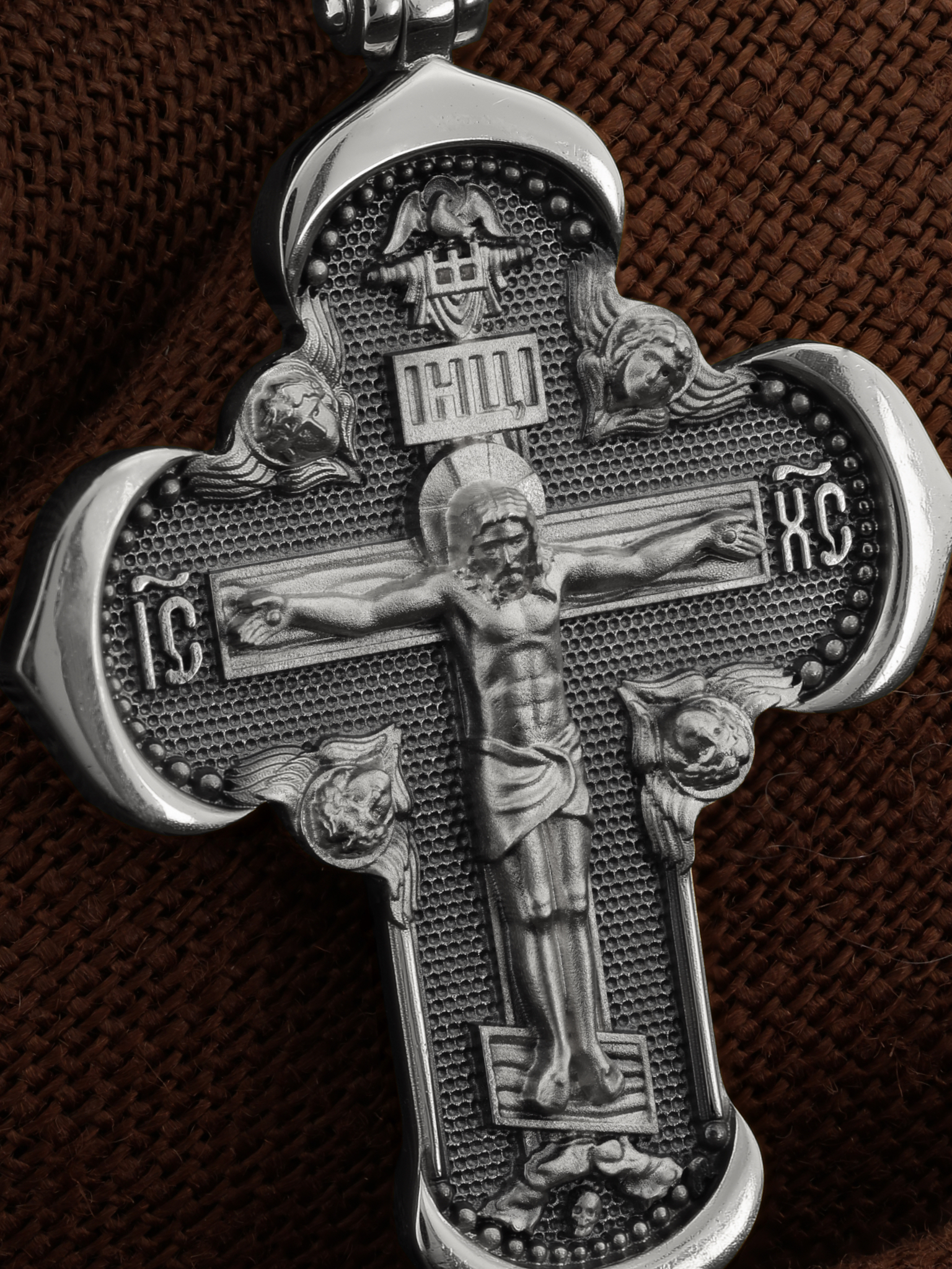 На лицевой стороне креста изображено Распятие Господа и Спасителя нашего Иисуса Христа, отдавшего Себя на смерть, для искупления грехов мира. Крест является символом жертвенной любви Всеблагого Бога к падшим людям, всепобеждающим духовным оружием христиан, основанием и средоточием церковной жизни. Господь сказал: кто хочет идти за Мною, отвергнись себя, и возьми крест свой, и следуй за Мною. (Мк. 8: 34). Над Распятием помещена надпись «Царь Славы». На верхней табличке, выше головы Иисуса, расположена надпись, составленная Понтием Пилатом — «IНЦI». Она означает «Иисус Назорей, Царь Иудейский». Надпись «IC» «ХC», означает Иисус Христос, помещается на разных сторонах поперечной перекладины креста. Возвышение, на котором стоит Крест, символизирует гору Голгофу, на которой произошло Распятие. Под подножием Креста изображена покоящаяся голова (череп) Адама. На кулонном кольце изображен Нерукотворный образ Господа и Спасителя нашего Иисуса Христа, чудесно отпечатавшийся на плате, которым Христос вытер свой лик.