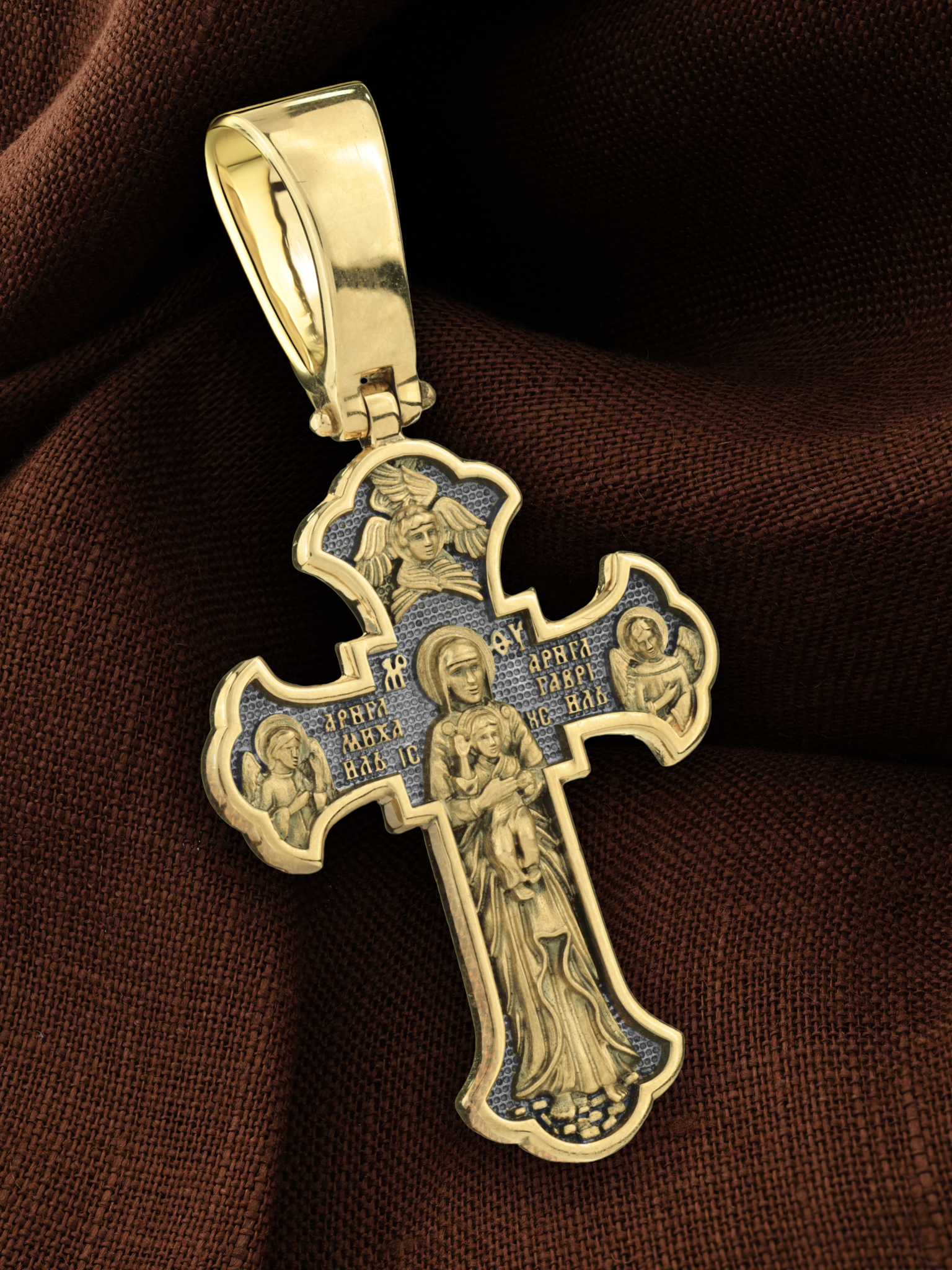 На обратной стороне креста в полный рост изображена Валаамская икона Божией Матери, над которой раскрыл свои крылья серафим. Этот образ написал в 1878 году иеромонах Валаамского монастыря о. Алипий. Валаамскую икону прославили многие чудеса, ее считают целительницей при разных недугах. Перед этим образом Богородицу молят в первую очередь об укреплении веры, просят даровать смирение, твердость в соблюдении заповедей Христовых и об исцелении. Богородице предстоят два архангела, Михаил и Гавриил.