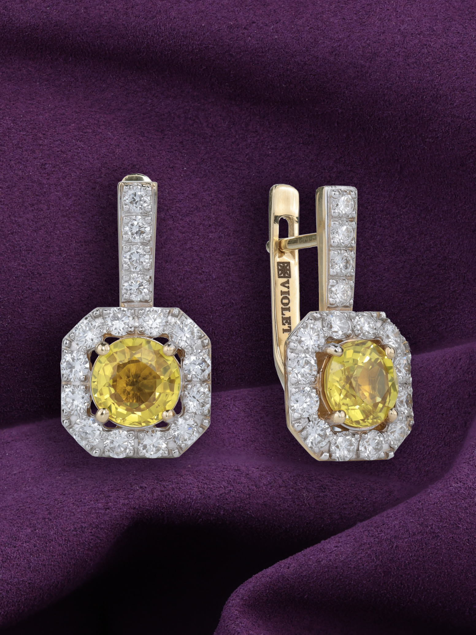 Серьги из лимонного золота c бриллиантами и сапфиром