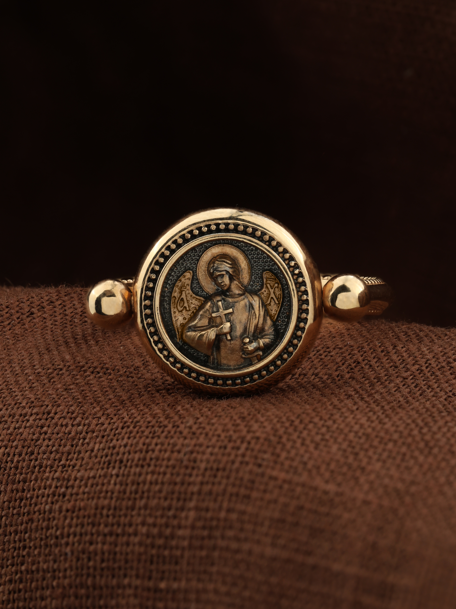 На перстне изображен Ангел Хранитель. По Православному учению, каждому, принявшему святое крещение, дается Господом Ангел Хранитель, который сопровождает человека всю его жизнь, помогая в добрых делах и охраняя от нападок злых духов. Святые отцы утверждают, что только верующий человек имеет рядом с собой Ангела Хранителя: «Тем, которые сподобились крещения и возносятся на высоту добродетелей, даны от Бога Ангелы, заботящиеся о них и содействующие им. В этом уверяет нас Господь, когда говорит, что есть Ангелы Хранители у всякого, кто верует в Него» (преп. Анастасий Синаит). Но Ангел Хранитель пребывает с христианином, если только мы не прогоним его греховными делами, поскольку «как дым разгоняет пчел, так и грех прогоняет от нас Ангела Хранителя» (свт. Василий Великий). Но и после завершения земного пути Ангел Хранитель не покидает христианина, а помогает душе преодолеть воздушные мытарства на пути в Царство Небесное.